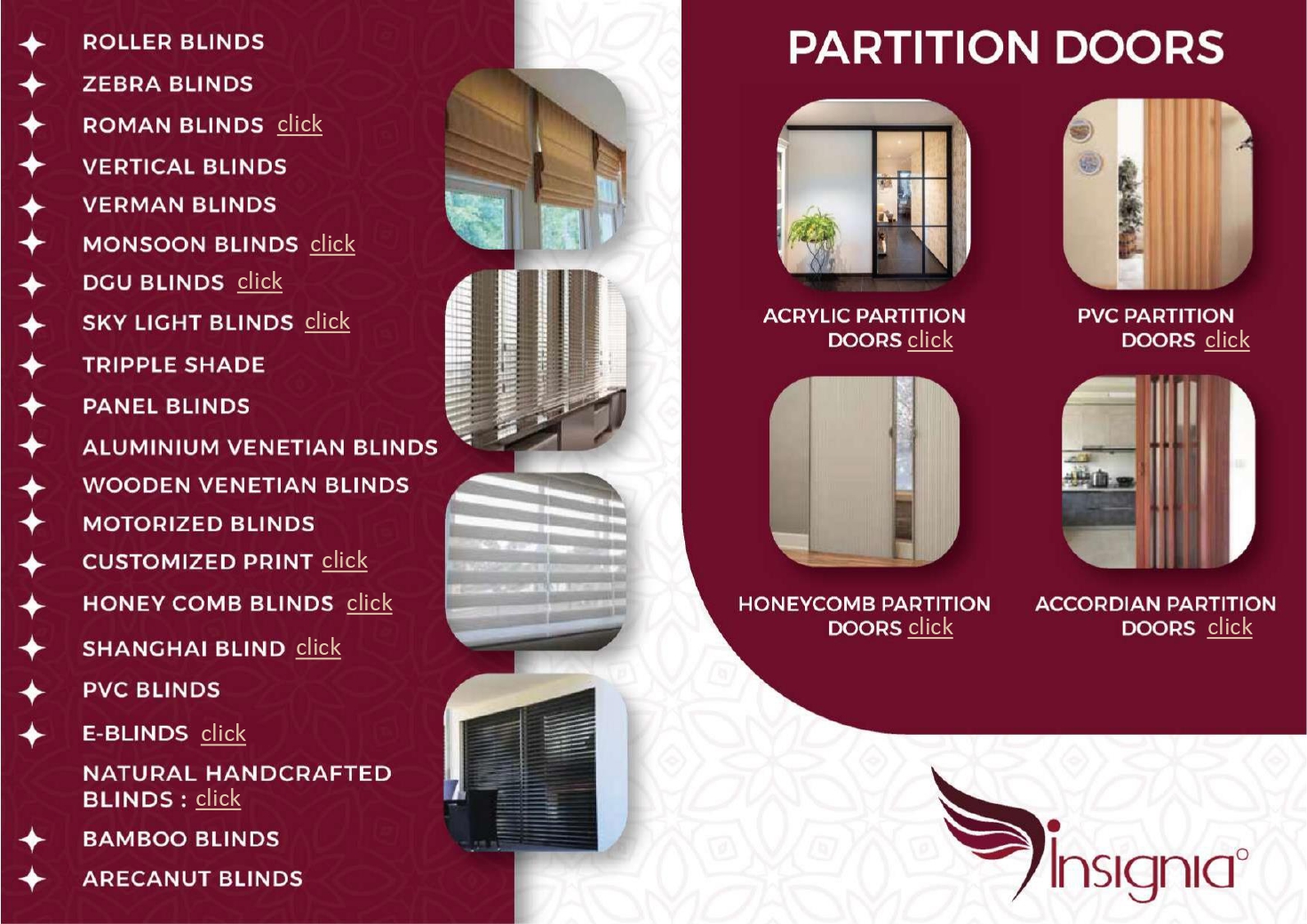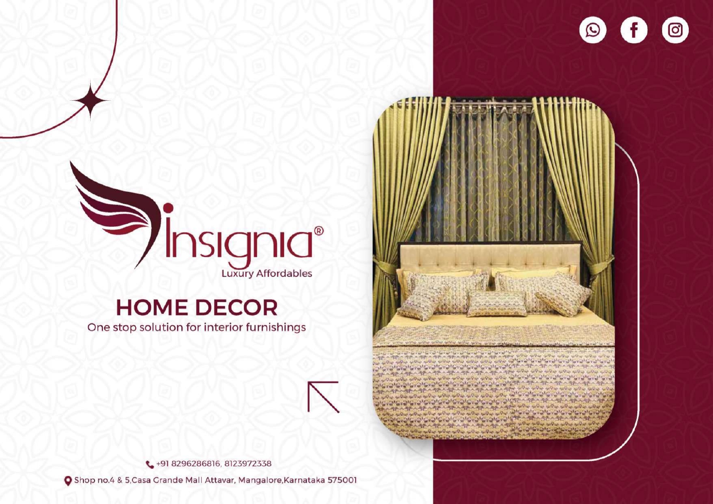 0 (0) INSIGNIA : Shop No 4 & 5, Casa Grande Mall, Attavar, Mangalore 575001 : : : 8296286816 LUXURY BED LINENS, MATTRESSES, CURTAINS, WALL COVERING, BLINDS SOFA & UPHOLSTERY, FLOORING. TIMINGS : 9.30AM TO 8.00PM, SUNDAY HOLIDAY Did you find t...
