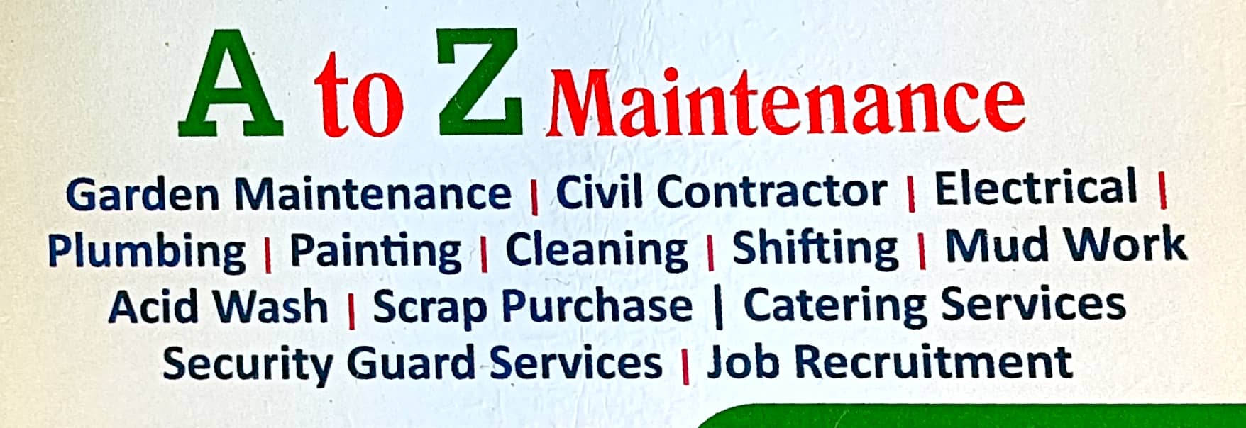 0 (0) A TO Z MAINTENANCE : Ground Floor, Dawood Complex, Near Flyover, Bikarnakatte, Mangalore : : : 8197376146, 9964513954 GARDEN MAINTENANCE, CIVIL CONTRACTOR, ELECTRICAL, PLUMBER, CLEANING, MUD WORK, CATERING. Did you find this Ad helpful? Click o...