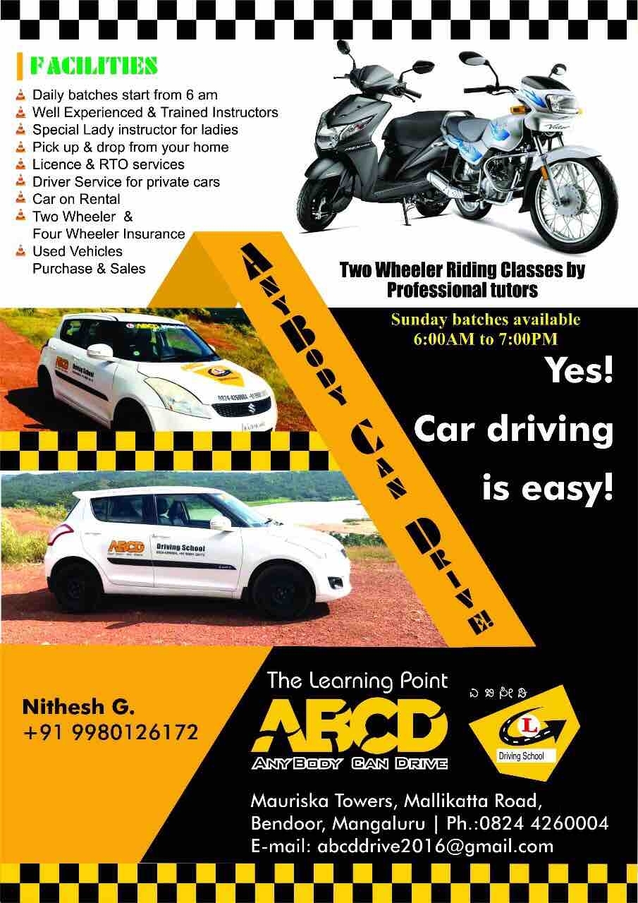 5 (1) ABCD DRIVING SCHOOL Anbody Can Drive Maurishka Towers Mallikatta Road Bendoor Mangaluru -02. 9980126172 , 0824-4260004 Did you find this Ad helpful? Click on a star to rate it! Submit Rating Thank you for Voting! No votes so far! Be the fi...