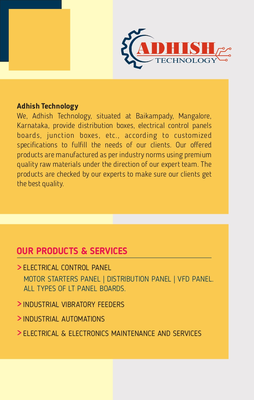 ELECTRICAL CONTROL PANEL, INDUSTRIAL VIBRATORY, INDUSTRIAL AUTOMATIONS, ELECTRICAL & ELECTRONICS MAINTENANCE AND SERVICE. TIMINGS : 9.00AM TO 5.30PM, SUNDAY : 9.00AM TO 12.00PM.