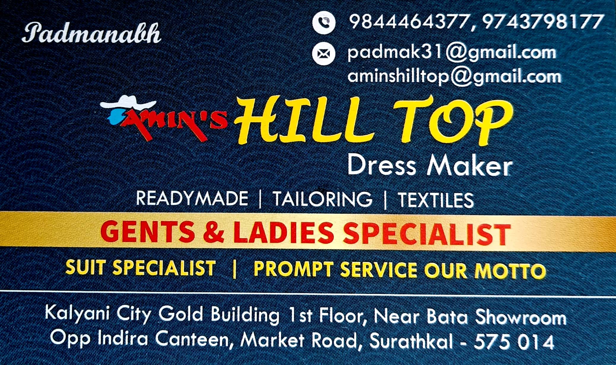 0 (0) AMIN’S HILL TOP : 1st Floor, Kalyani City Gold Building, Near Bata Showroom, Opp Indira Canteen, Market Road, Surathkal, Mangalore : : : 9844464377, 7359655177, 9743798177 UNIFORM DESIGNERS, UNIFORM MARKET, JERSEY MAKER, READY MADE GARMEN...