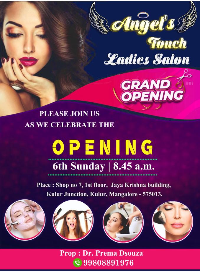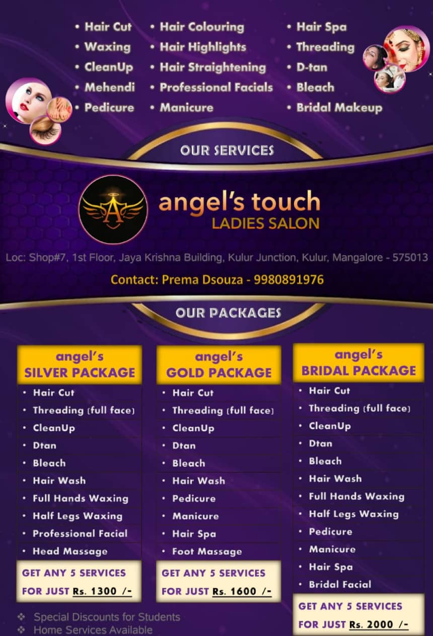 5 (1) ANGEL’S TOUCH LADIES SALON : Shop #7, 1st Floor, Jaya Krishna Building, Kulur Junction, Kulur, Mangalore 575013 : : : 9980891976 BEAUTY PARLOUR, MALEUP ARTIST, BRIDAL MAKRUP, TIMINGS : 9.30AM TO 7.30PM, SUNDAY ON APPOINTMENT Did you find ...