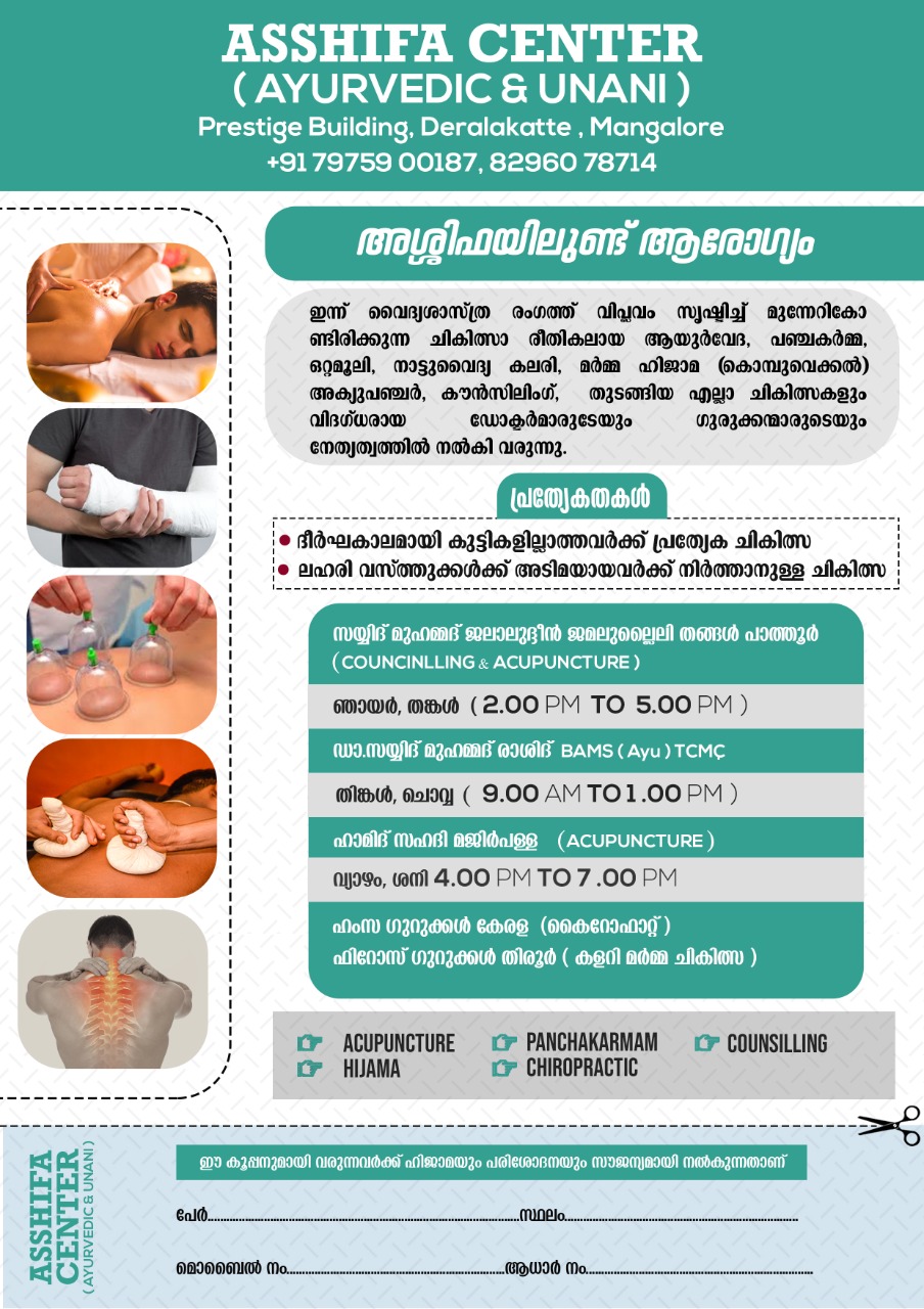 0 (0) ASSHIFA CENTER & THANGAL PHARMACY : Prestige Building, Near More Super Market, Deralakatte,Mangalore : : : 7975900187, 8296078714 SAYYAD MUHAMMAD JALALUDDIN ASTROLOGY COUNCELLING, HIJAMA, TIMINGS : 9.00AM TO 6.00PM, SUNDAY HOLIDAY, MONDAY &...