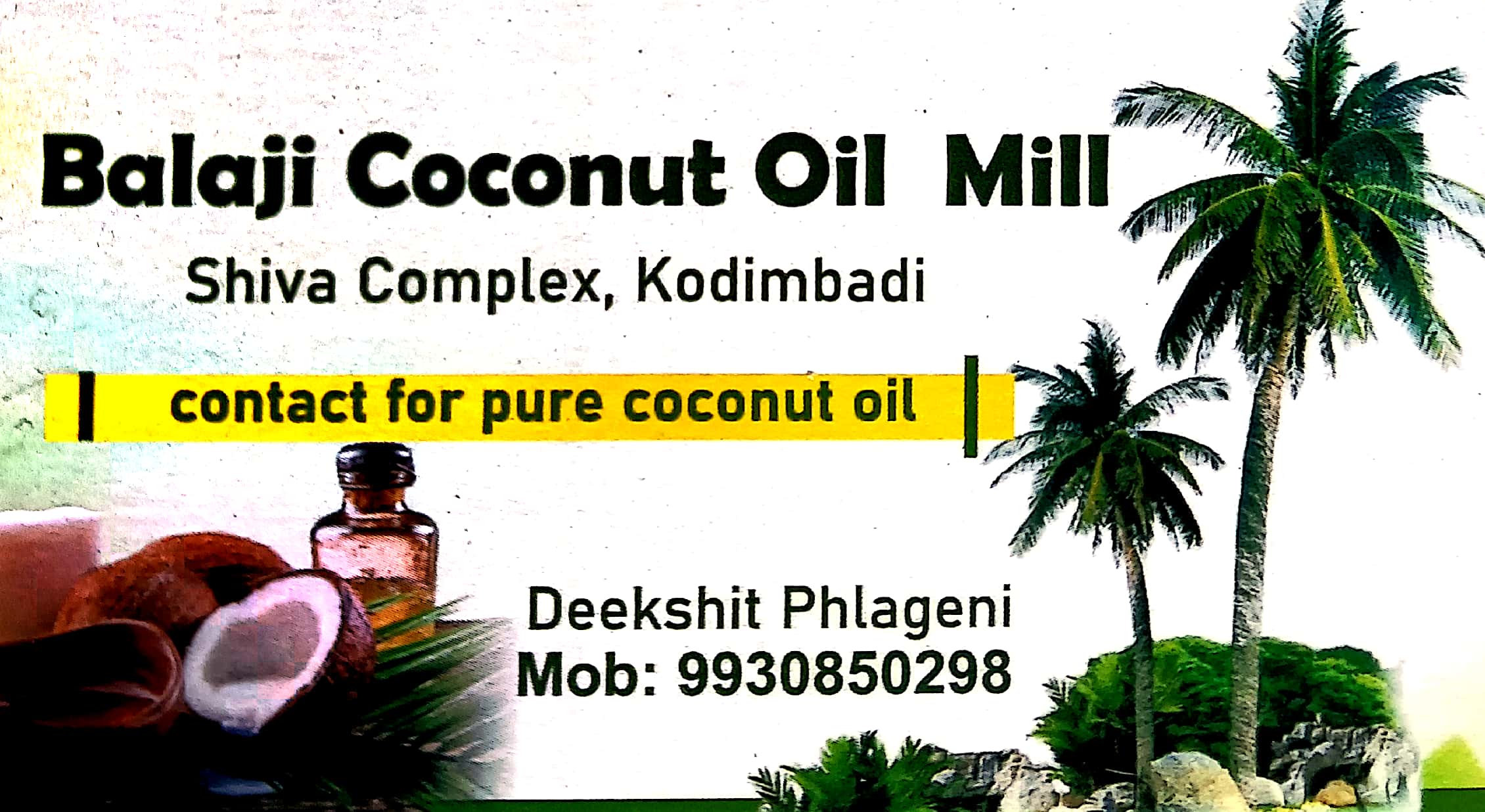 0 (0) BALAJI COCONUT OIL MILL : Shiva Complex, Kodimbadi, Puttur : : : 9930850298, 8792029298 COCONUT OIL Did you find this Ad helpful? Click on a star to rate it! Submit Rating Thank you for Voting! No votes so far! Be the first to rate this ad. We are sorry that this ad was