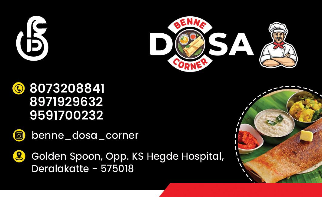 0 (0) BENNE DOSA CORNER : Golden Spoon, Opp KS Hegde, Deralakatte, Mangalore : : : 9591700232, 8971929632 DOSA CENTER Did you find this Ad helpful? Click on a star to rate it! Submit Rating Thank you for Voting! No votes so far! Be the first to rate this ad. We are sorry that this