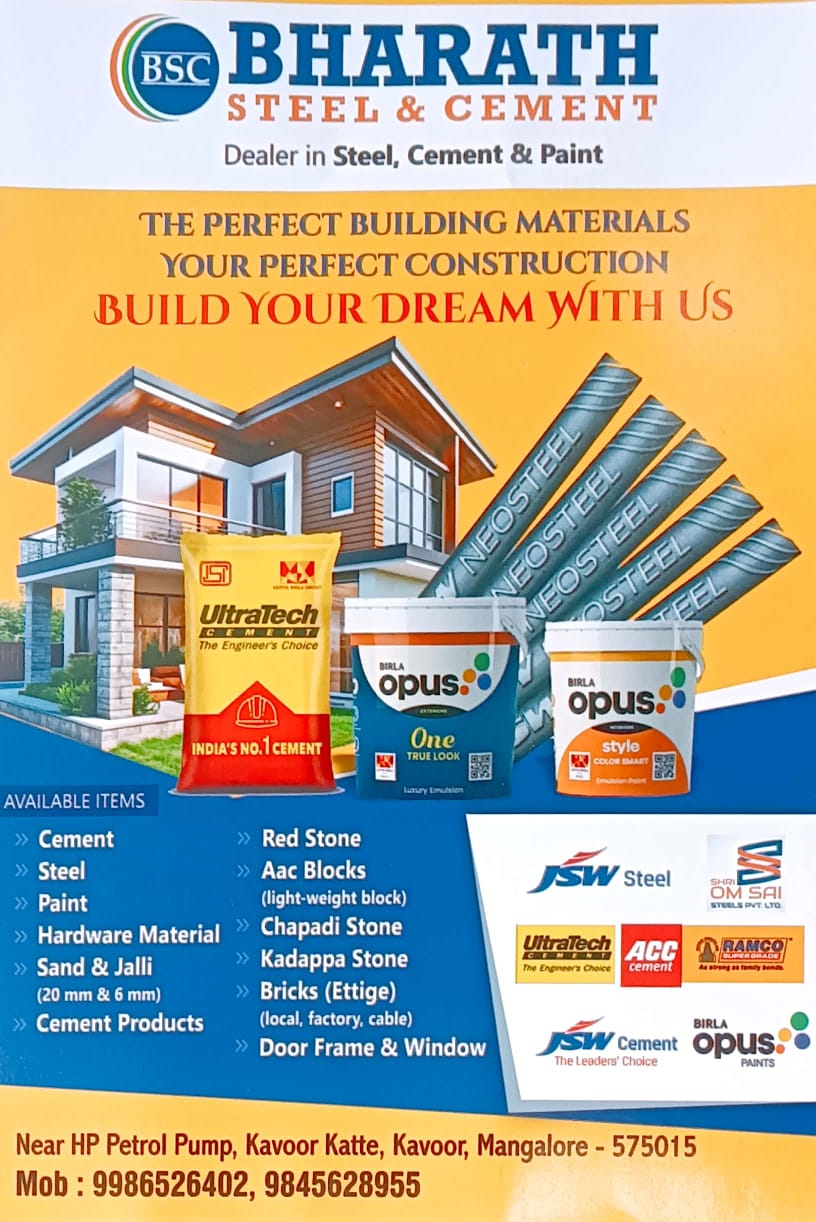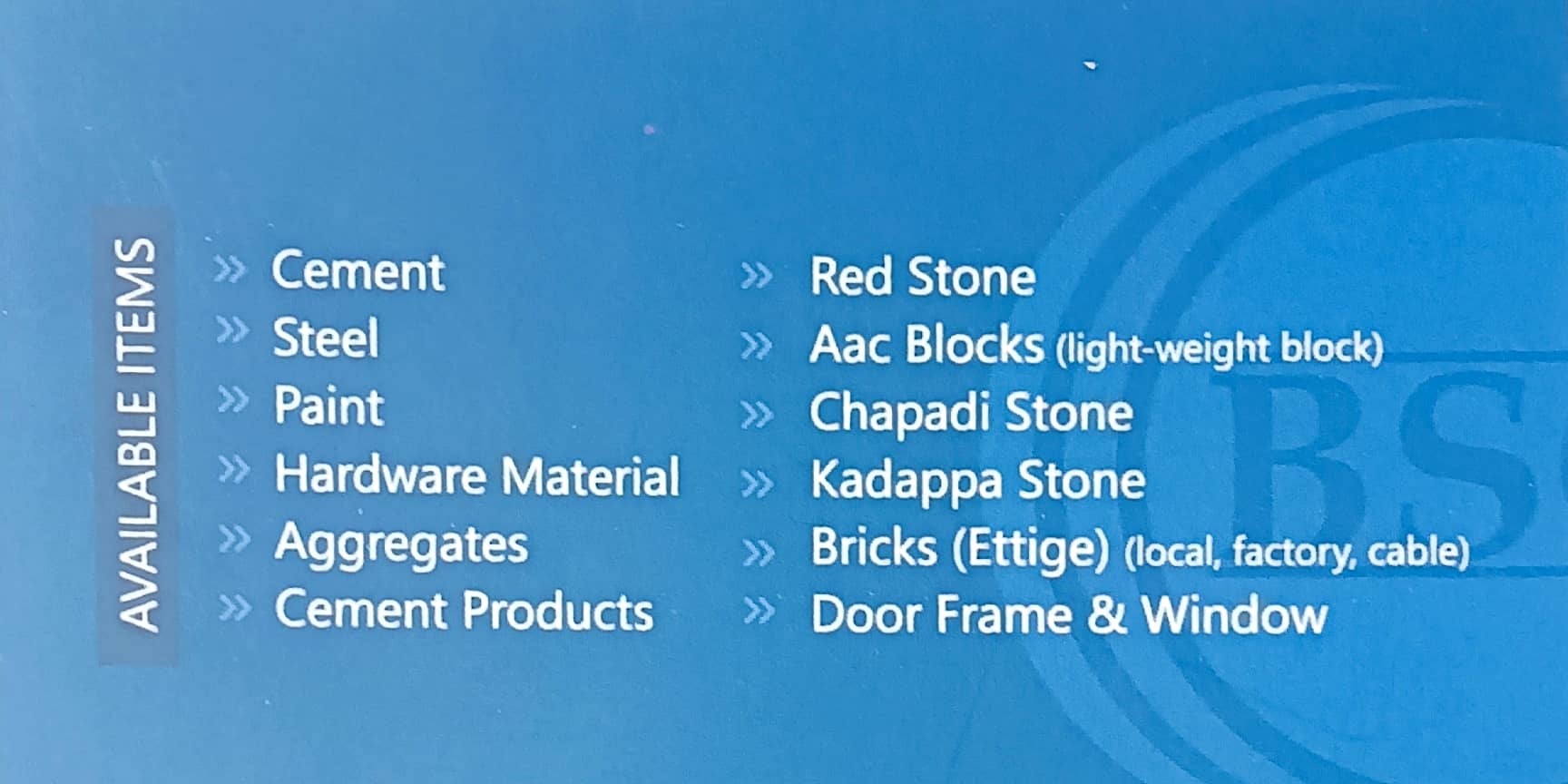 STEEL,CEMENT, PAINTS, AAC BLOCK, BUILDING MATERIAL. TIMINGS : 8.00AM TO 6.00PM, SUNDAY : 8.00AM TO 12.00PM.