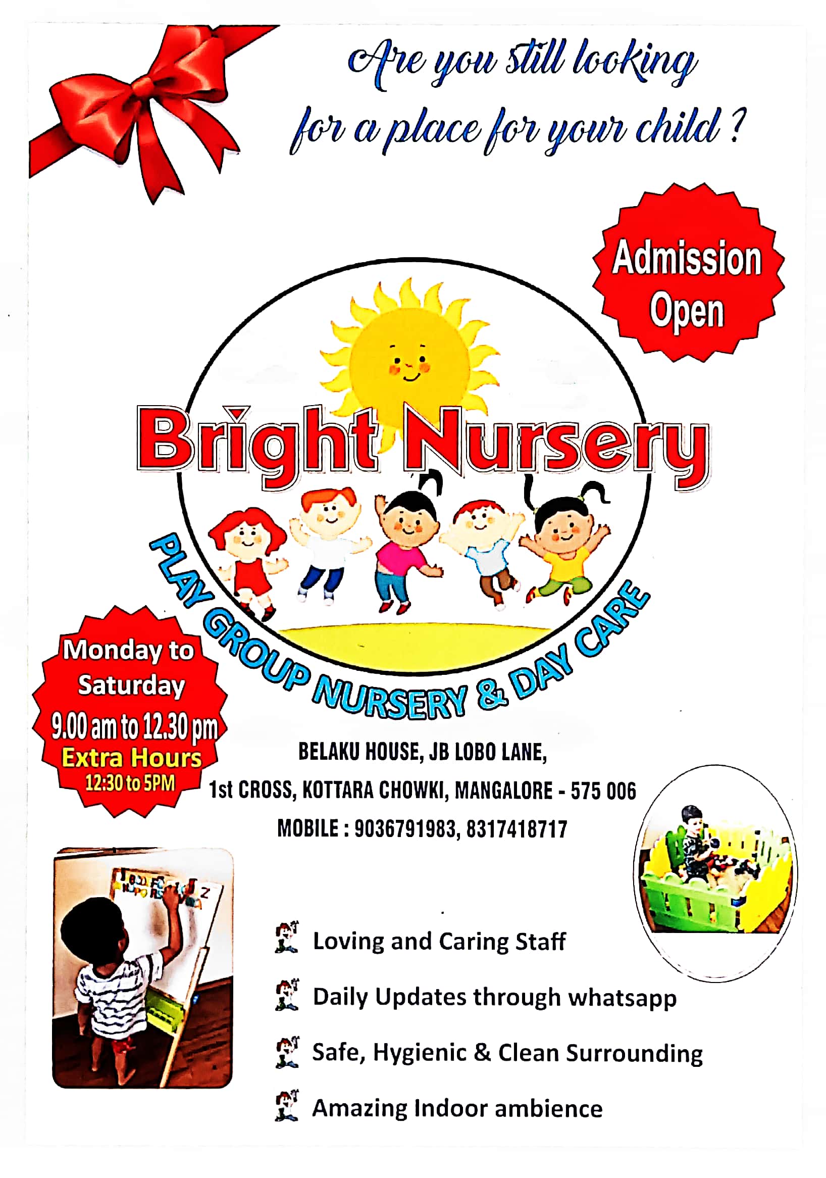 PLAY SCHOOL, NURSERY, DAY CARE.TIMINGS : 9.00AM TO 12.30PM, EXTRA HOURS : 12.30PM TO 5.00PM