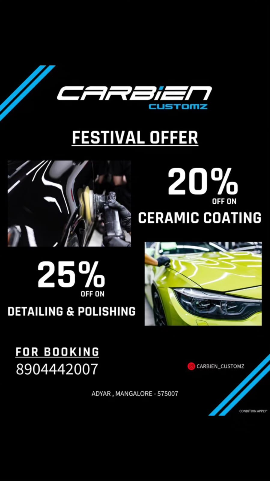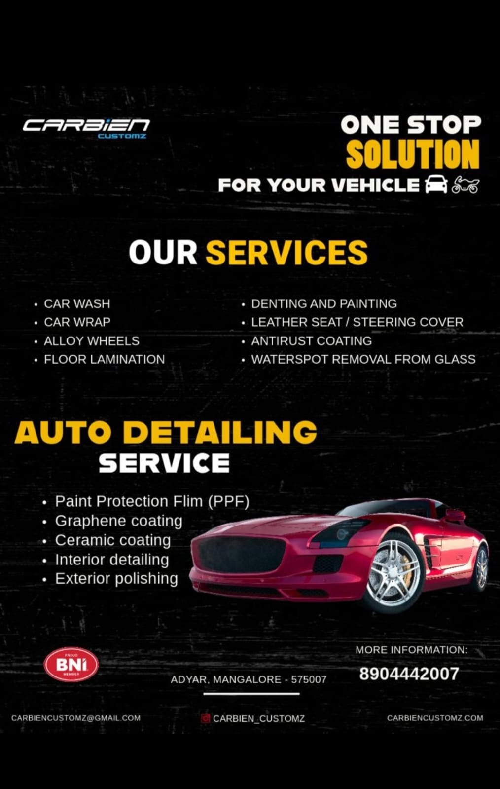 0 (0) CARBIEN CUSTOMZ : Adyar, Mangalore : : : 8904442007 CAR INTERIOR, CAR ACESSORIES, CERAMIC COATING Did you find this Ad helpful? Click on a star to rate it! Submit Rating Thank you for Voting! No votes so far! Be the first to rate this ad. We are sorry that this ad was not