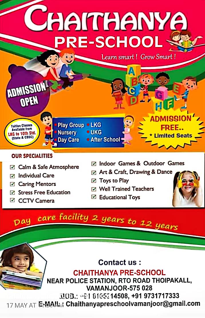 PRE SCHOOL, NURSERY, PLAY SCHOOL, DAY CARE, KINDER GARDEN, LKG, UKG, TUITION CLASSES, TIMINGS : 8.00AM TO 6.00PM, SUNDAY HOLIDAY
