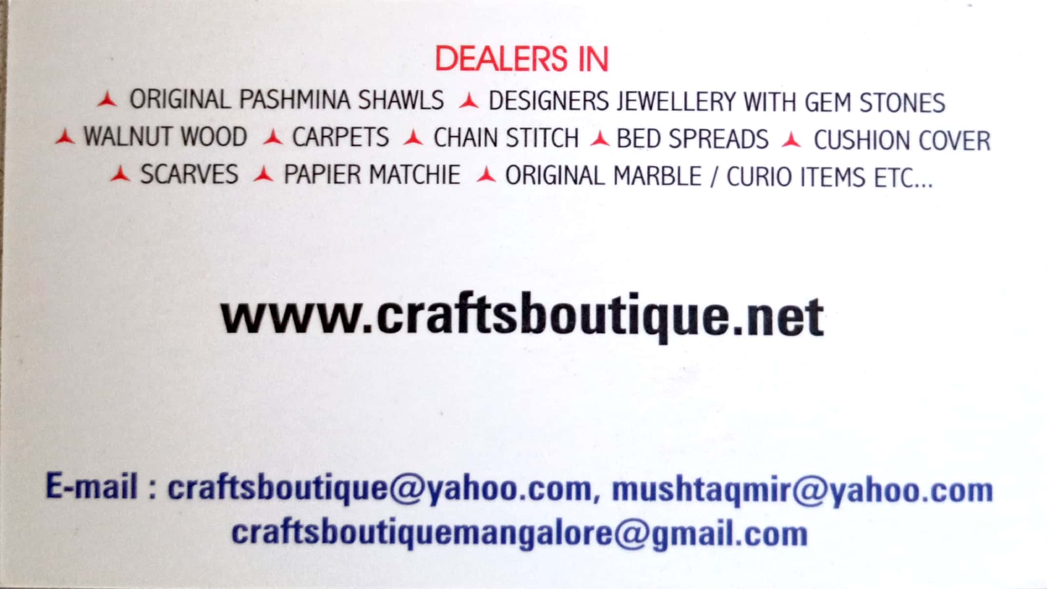: craftsboutique@yahoo.com, mushtaqmir@yahoo.com, craftsboutiquemangalore@gmail.com