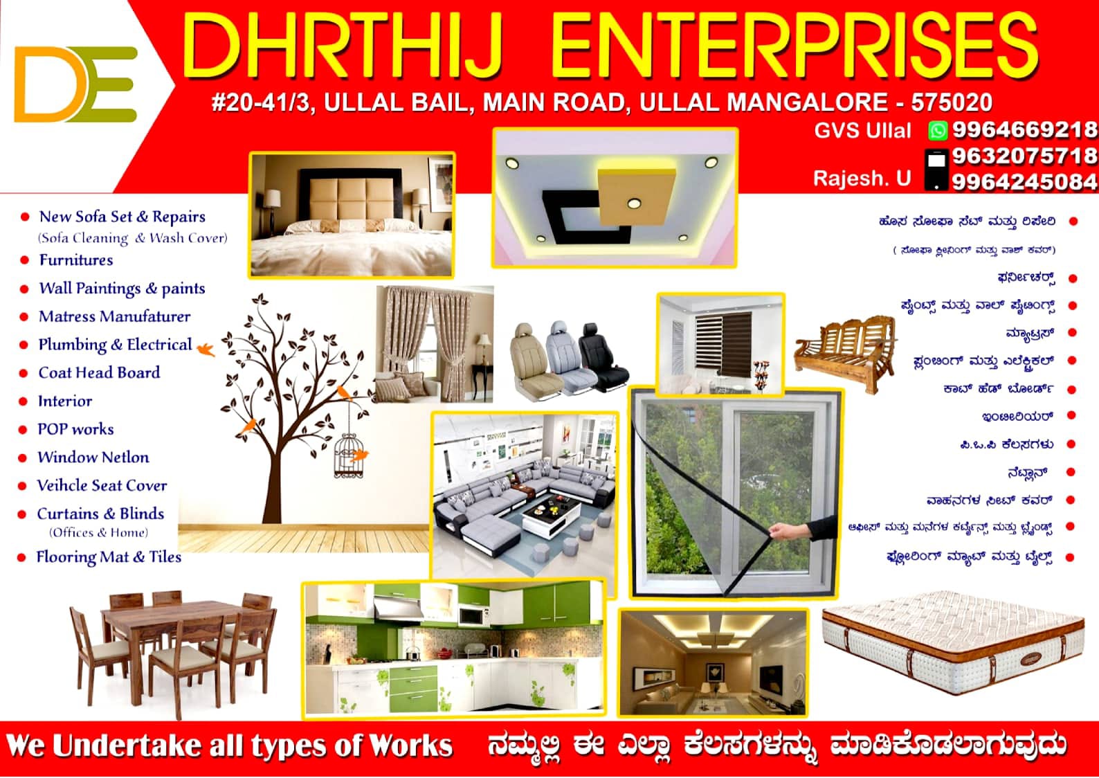 FURNTURE WORKS, SOFA WORKS, CURTAIN, MATRESS MANUFAVTURER, PLUMBING, ELECTRICAL, INTERIOR WORK, POP WORK, WINDOW NETLON, WEHICLE SEAT COVER, BLINDS, FLOORING MAT, WOODEN TILE, SOFA REPAIR, SOFA CLEANING.