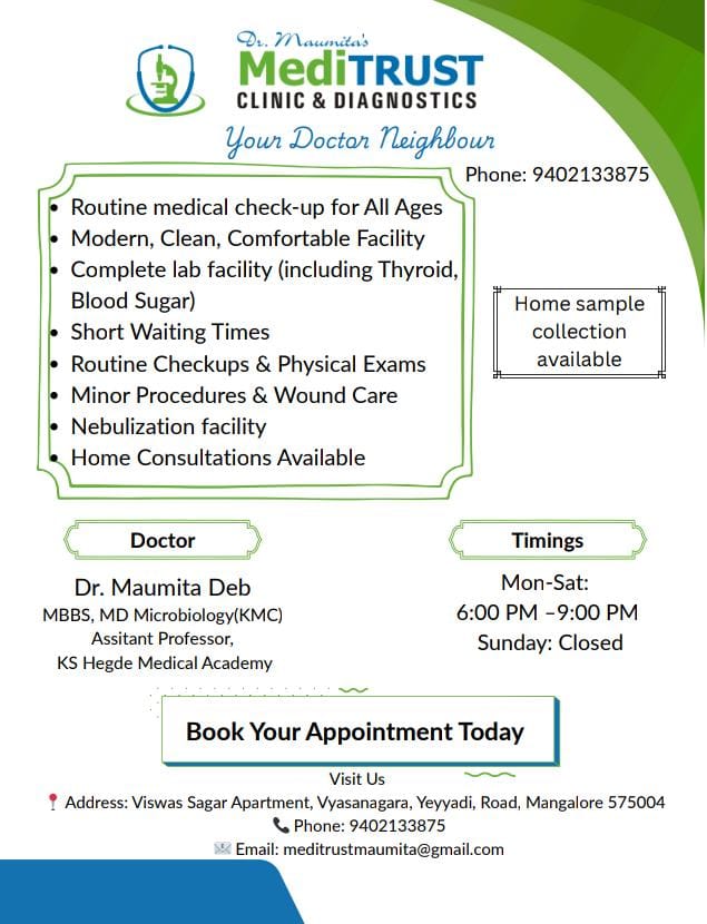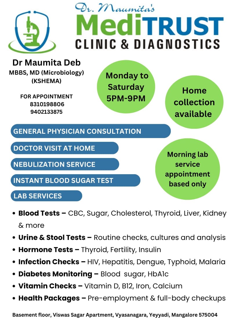 0 (0) DR MAUMITA MEDITRUST CLINIC & DIAGNOSTICS : Basement Floor, Vishwas Sagar Apartment, Vyasanagara, Yeyyadi, Mangalore : : 9402133875, 8310198806 CLINIC, LAB SERVICES, DIAGNOSTIC LAB, GENERAL PHYSICIAN, NEBULIZATION SERVICES. Did you find thi...