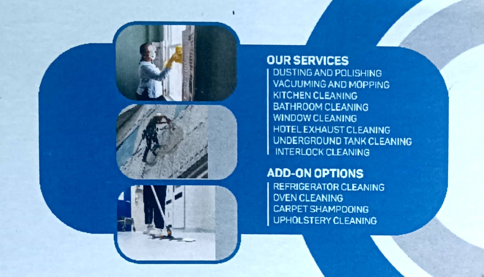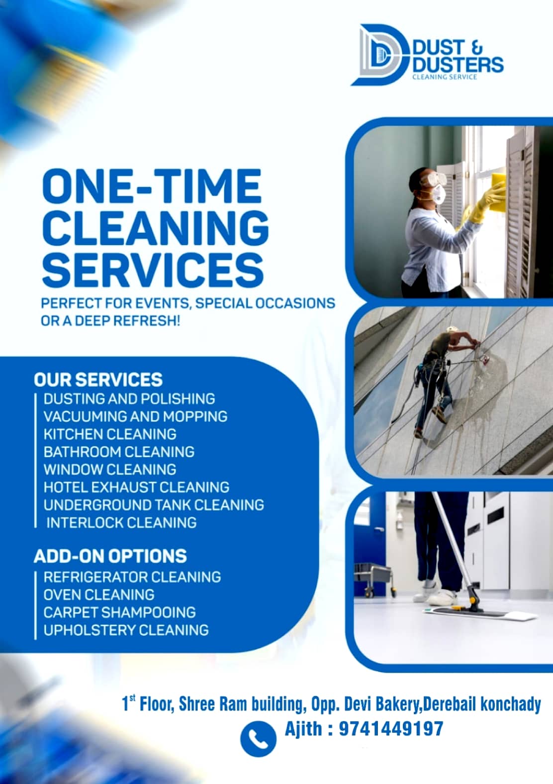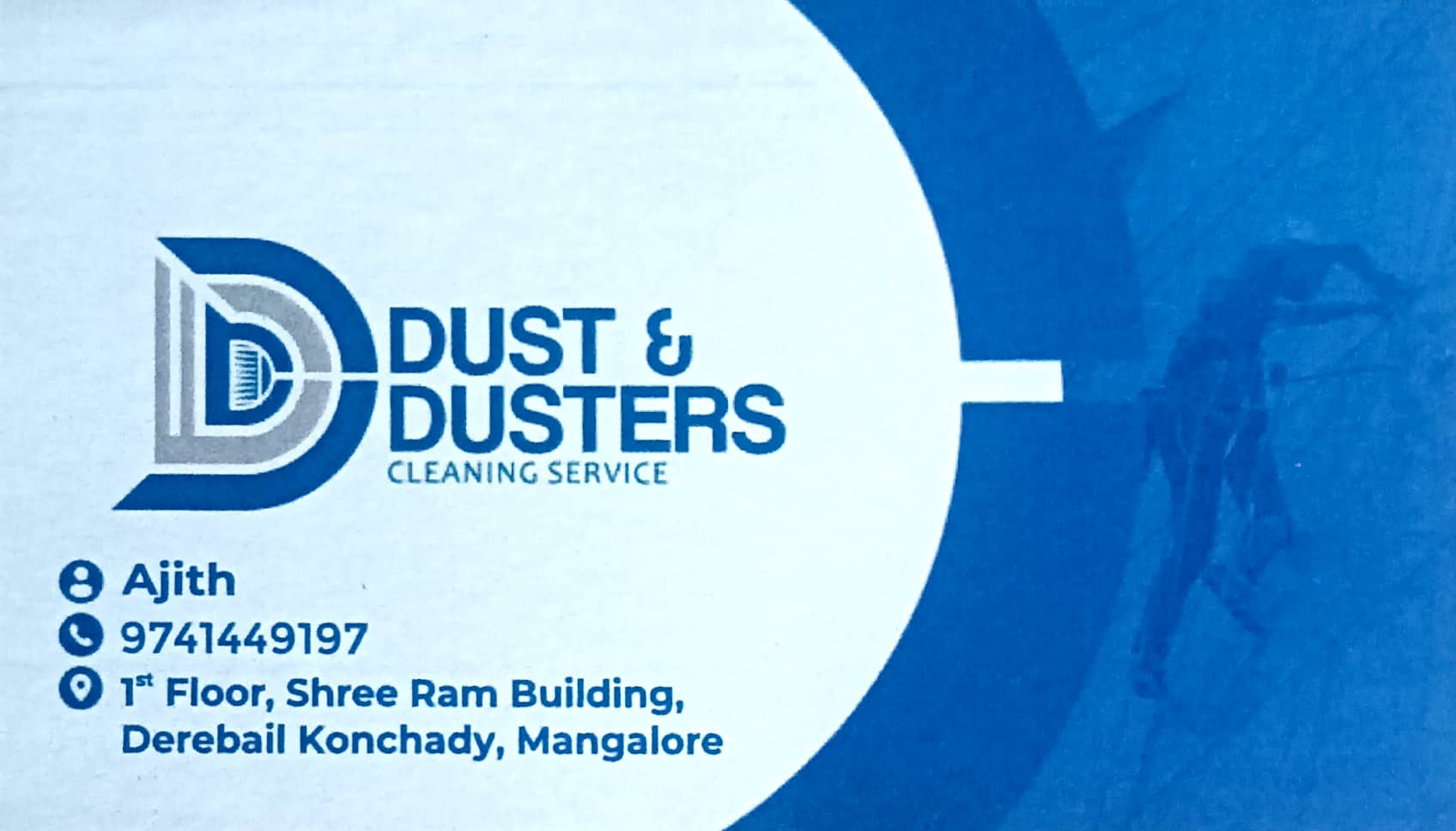 0 (0) DUST & DUSTERS CLEANING SERVICE : 1st Floor, Shree Ram Building, Derebail Konchady, Mangalore : : : 9741449197 HOUSE KEEPING SERVICE, CLEANING SERVICE, TANK CLEANING. TIMINGS : 9.30AM TO 6.30PM, SUNDAY HOLIDAY. Did you find this Ad helpful?...