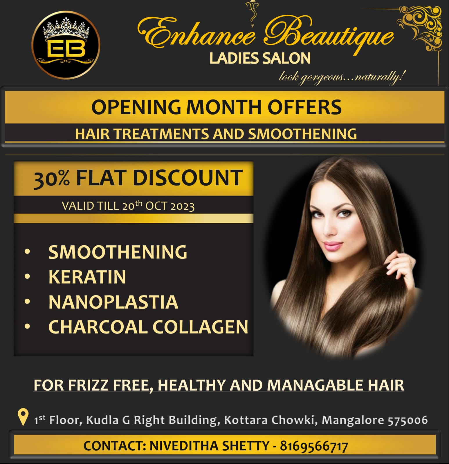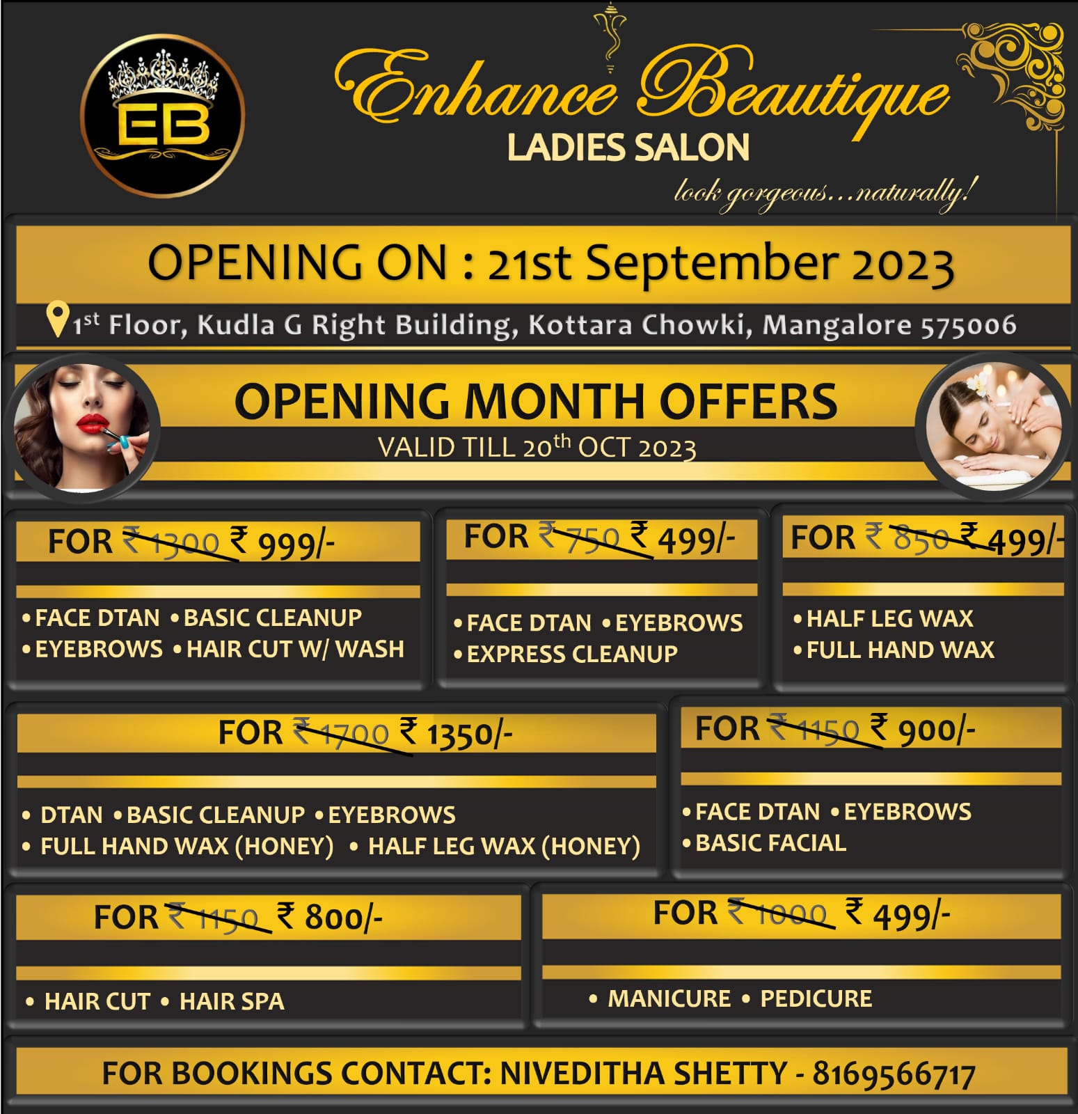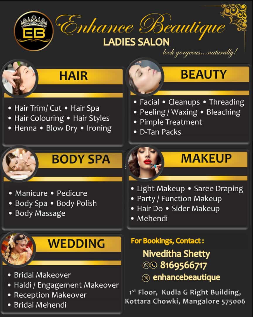 0 (0) ENHANCE BEAUTIQUE : 1st Floor, Kalyani Kudla G Right Building, Kottara Chowki, Mangalore : : : 8169566717 BEAUTY PARLOUR, MAKEUP ARTIST. Did you find this Ad helpful? Click on a star to rate it! Submit Rating Thank you for Voting! No votes so far! Be the first to rate this ad. We are