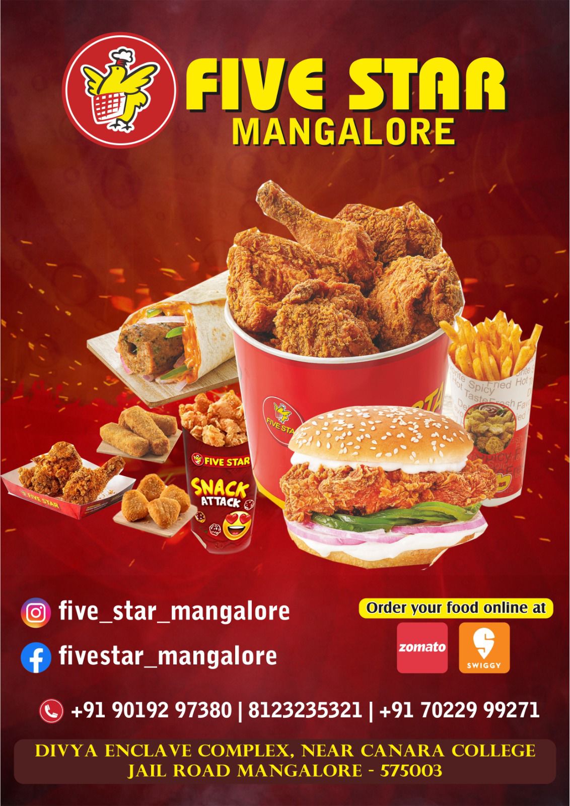 0 (0) FIVE STAR MANGALORE : Ground Floor, Divya Enclave Complex, Near Canara College, Jail Road, Mangalore : : : 9019297380, 8123235321 CAFE, FRIED CHICKEN BURGER, FRENCH FRIES.TIMINGS : 10.30AM TO 11.00PM. Did you find this Ad helpful? Click on a st...