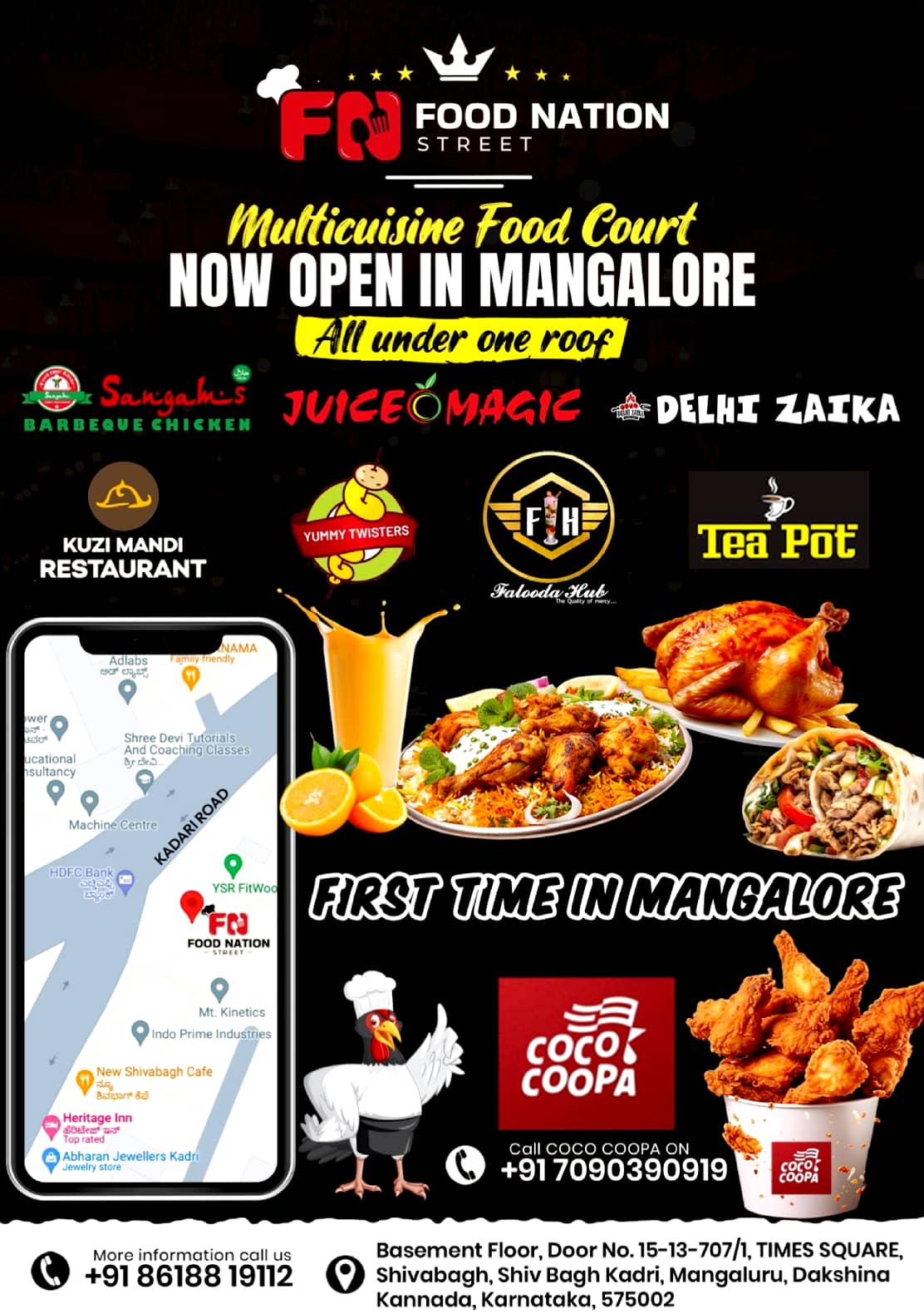 1 (1) FOOD NATION STREET : Time Square Building, Basement Floor, Below KFC, Shivabagh, Kadri, Mangalore 575002 : : : 8618819112, 7090390919 FOOD COURT, CAFE, JUICE SHOP, RESTAURANT. TIMINGS : 12.00PM TO 12.00AM Did you find this Ad helpful? Click on ...