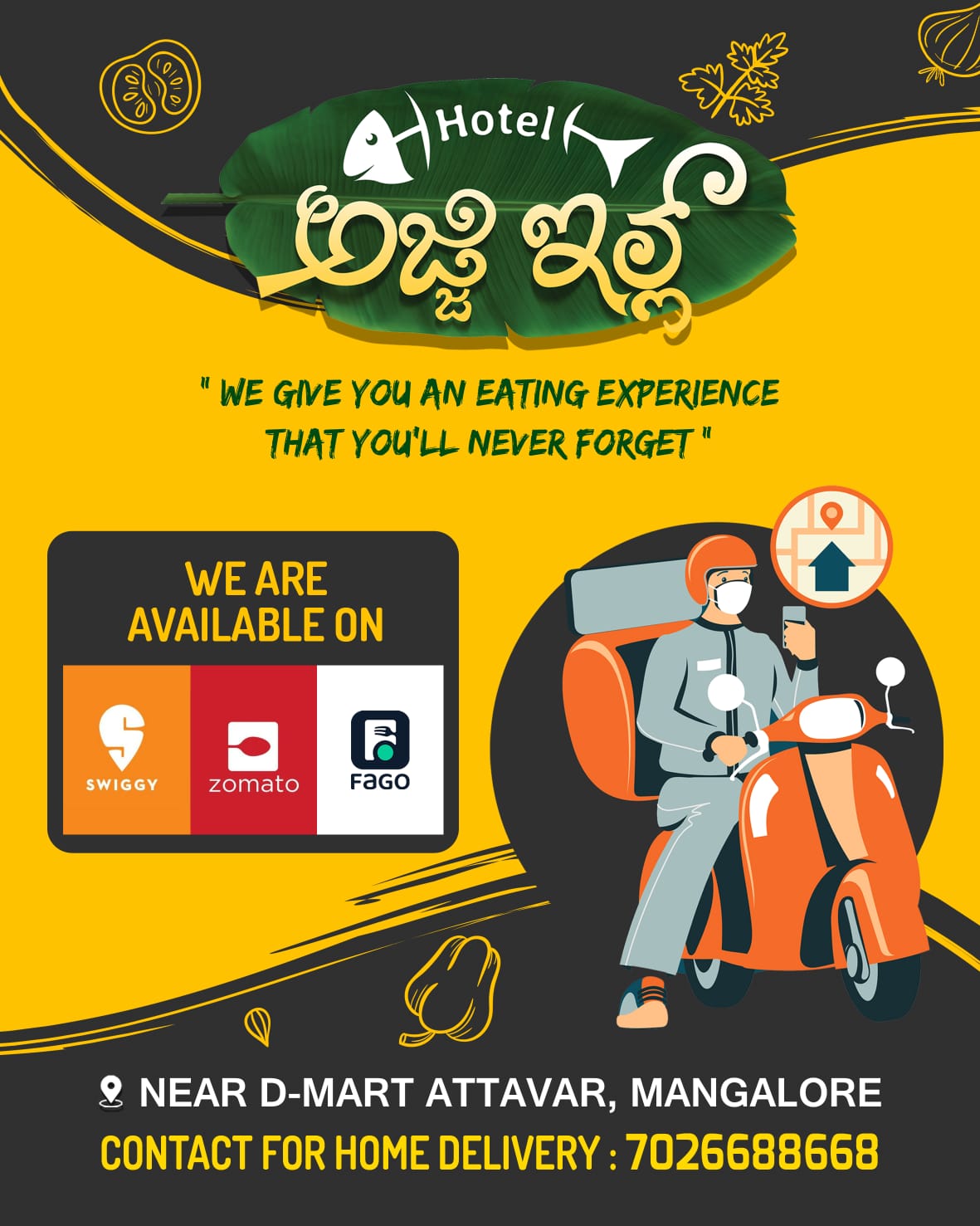 3 (2) HOTEL AJJI ILL : Near D Mart Attavara : : : 7026688668, 8152935557 RESTAURANT, HOME DELIVERY, Did you find this Ad helpful? Click on a star to rate it! Submit Rating Thank you for Voting! No votes so far! Be the first to rate this ad. We are sorry that this ad was
