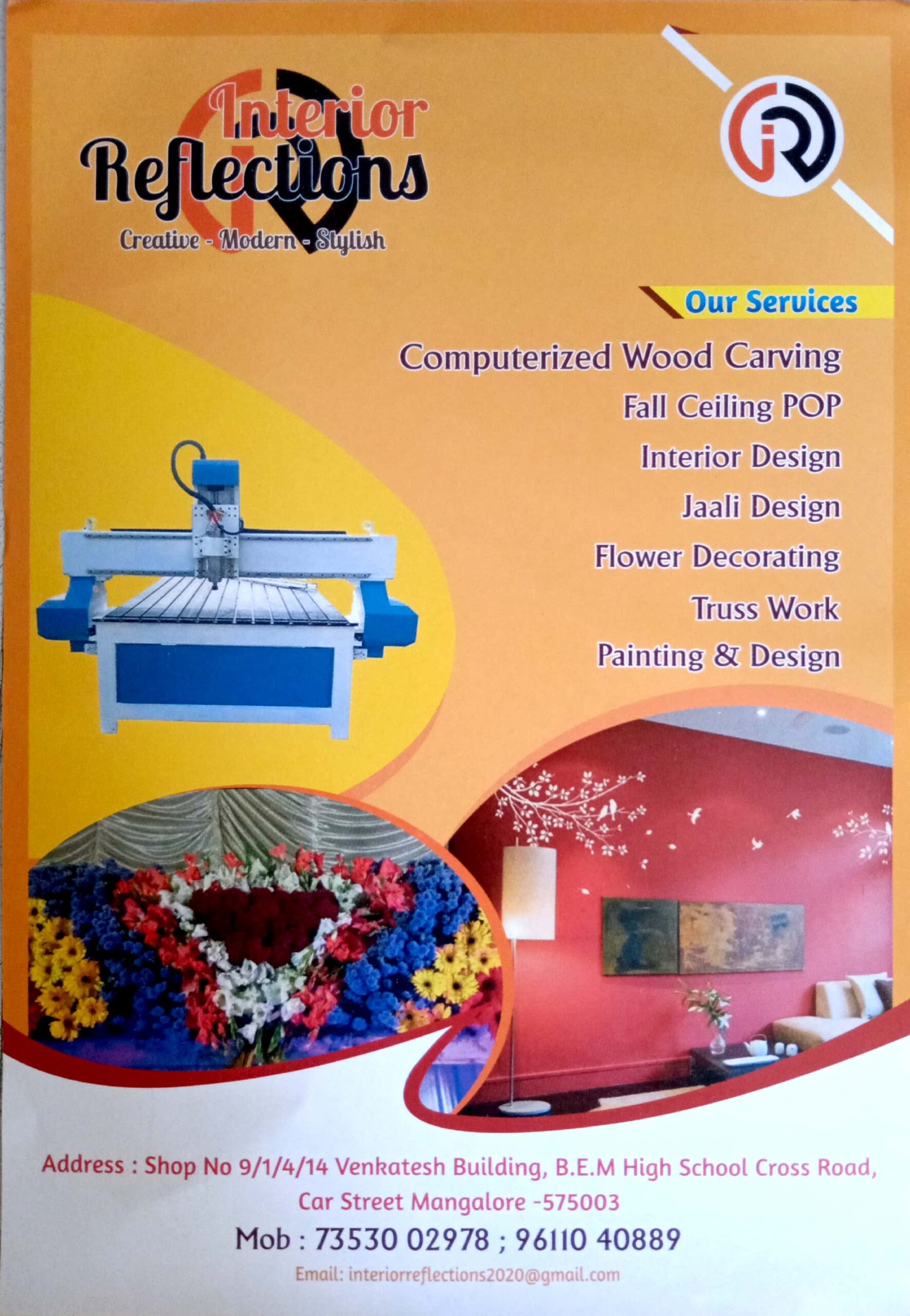 0 (0) INTERIOR REFLECTIONS : Shop No 9/1/4/14, Venjatesh Buliding, BEM High School Road, Carstreet , Mangalore-575003 : : : 7353002978, 9611040889 INTERIOR DESIGNER, JAALI DESIGN, FLOWER DECORATION, PAINTING & DESIGN, FALL CEILING POP, TRUSS WORK...