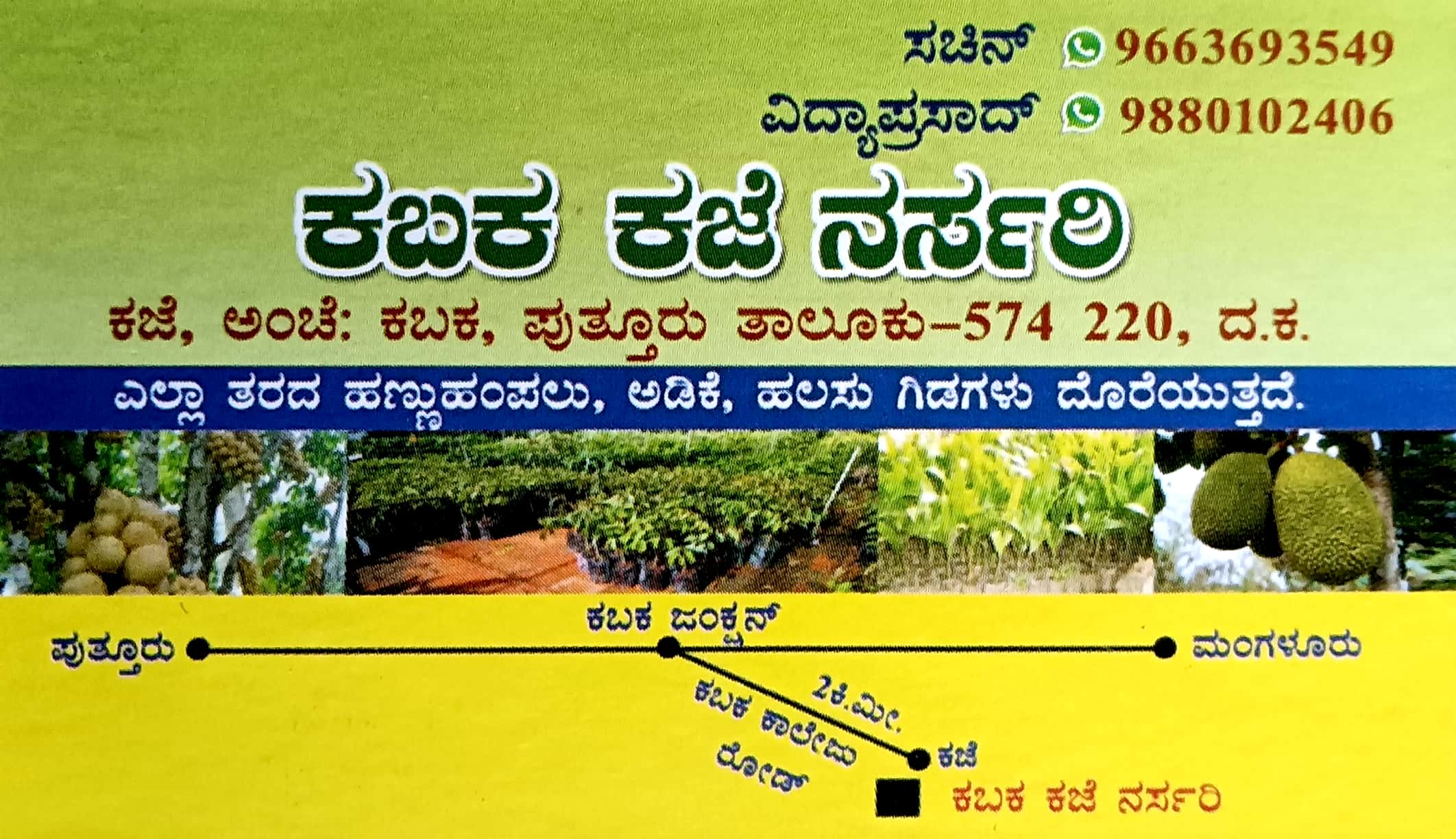 0 (0) KABAKA KAJE NURSERY : Kabaka Govt College Road, Kaje, Kabaka, Puttur : : : 9663693549, 9880102406 NURSERY Did you find this Ad helpful? Click on a star to rate it! Submit Rating Thank you for Voting! No votes so far! Be the first to rate this ad. We are sorry that this ad