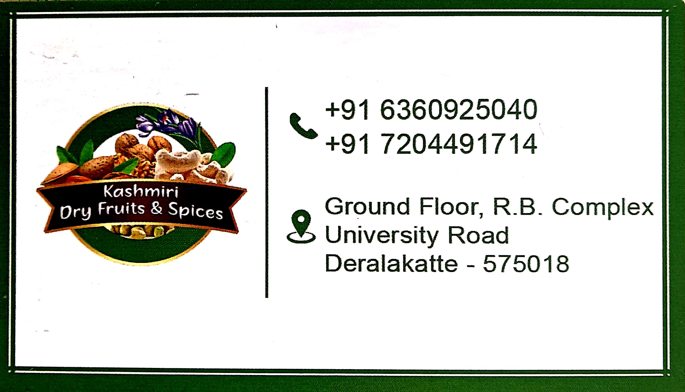 4 (4) KASHMIRI DRY FRUITS & SPICES : Ground Floor, RB Complex, University Road, Deralakatte , Mangalore 575018 : : : 6360925040, 7204491714 DRY FRUITS, SPICES Did you find this Ad helpful? Click on a star to rate it! Submit Rating Thank you for V...