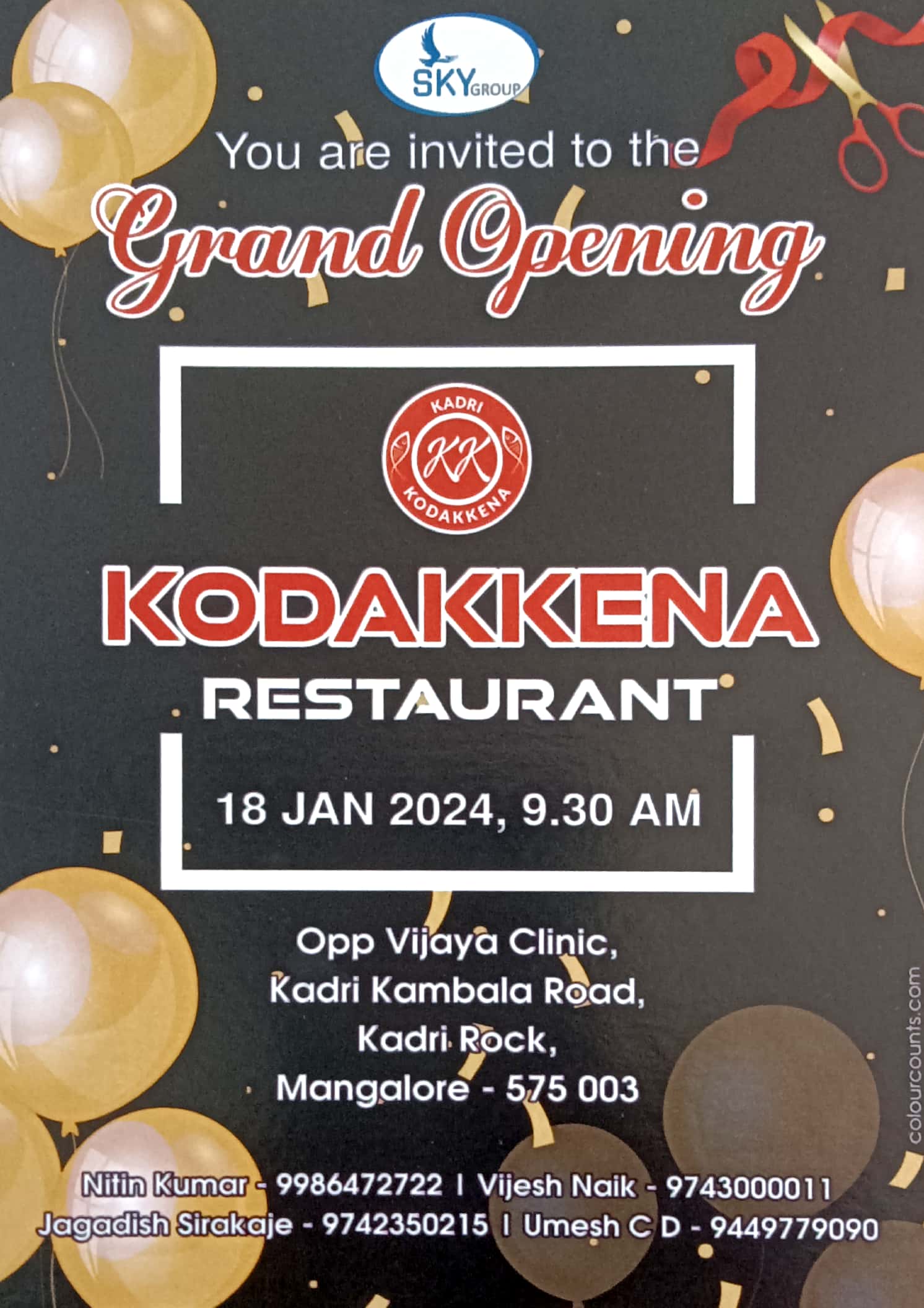 0 (0) KODAKKENA RESTAURANT : Opp Vijaya Clinic, Kadri Kambla Road, Kadri, Mangalore : nithinksuvarna@gmail.com : : 9986472722 FAMILY RESTAURANT. Did you find this Ad helpful? Click on a star to rate it! Submit Rating Thank you for Voting! No votes so...