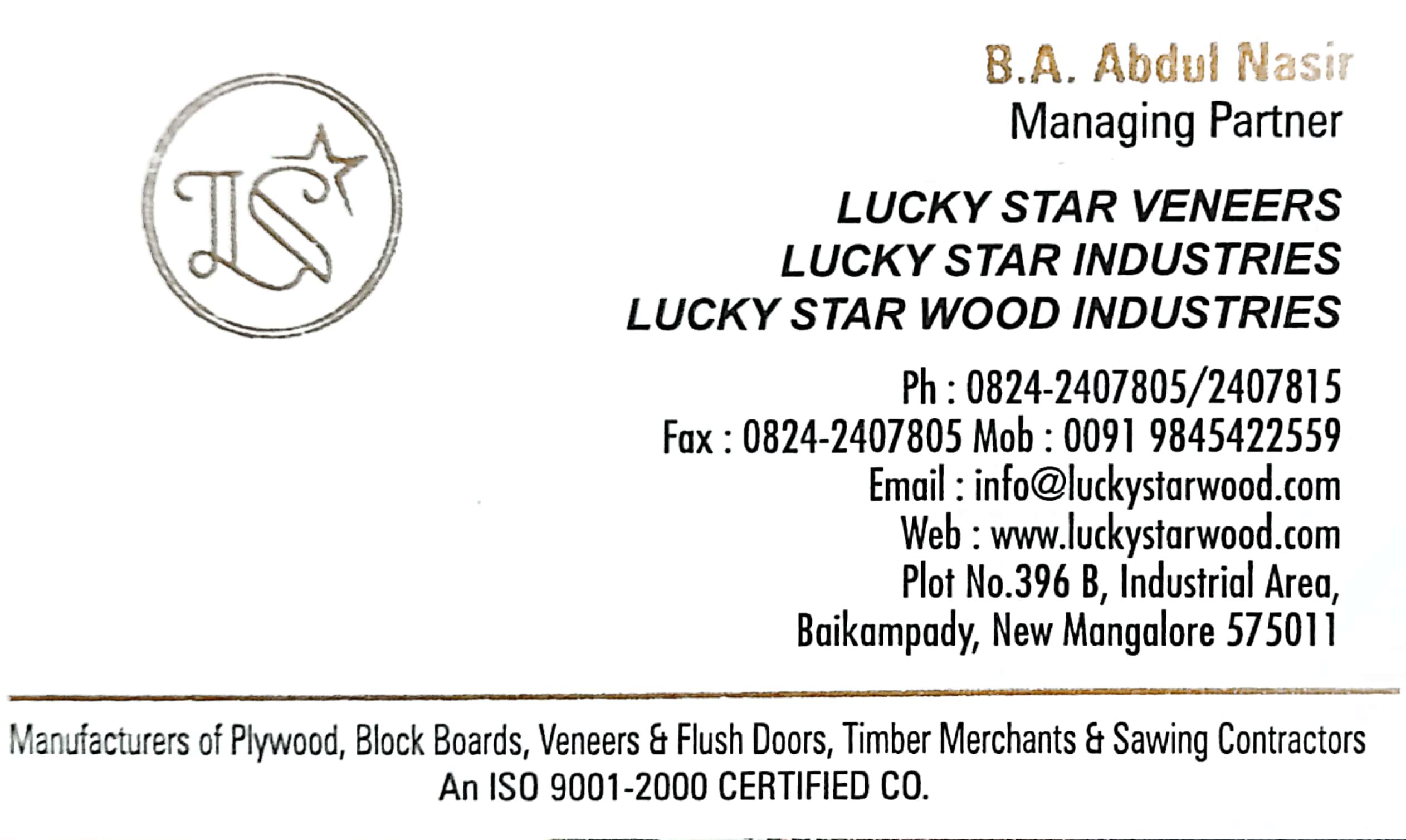 0 (0) LUCKY STAR INDUSTRIES : Plot No 396 B, Industrial Area, Baikampady, Mangalore : : : 9845422559, 0824-2407805, 0824-2407815 PLYWOOD, BLOCK BOARDS, TIMBER. TIMINGS : 9.00AM TO 6.00PM, SUNDAY HOLIDAY. Did you find this Ad helpful? Click on a star ...
