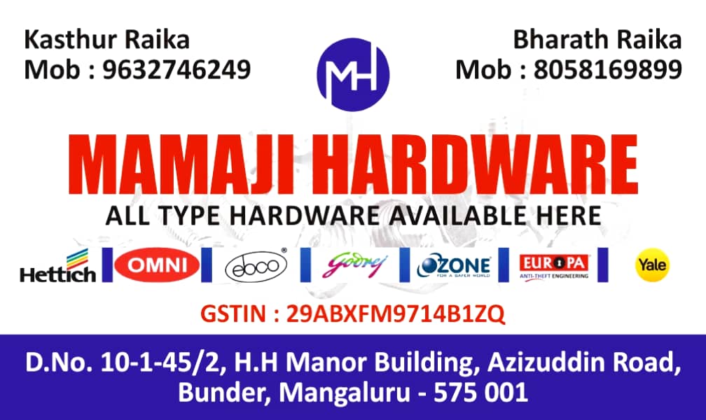 0 (0) MAMAJI HARDWARE : D No 10-1-45/2, HH Manor Building, Azizuddin Road, Bunder, Mangalore 575001 : : : 9632746249, 8058169899 HARDWARE. TIMINGS : 8.30AM TO 8.00PM, SUNDAY : 9.00AM TO 2.00PM Did you find this Ad helpful? Click on a star to rate it!...