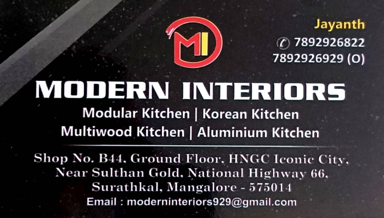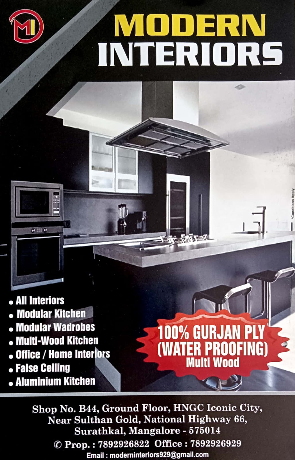 0 (0) MODERN INTERIORS : Shop No B44, Ground Floor, HNGC ICON City Building, Near Sulthan Gold, NH66,Surathkal, Mangalore : : : 7892926822, 7892926929 INTERIORS, MODULER KITCHEN. TIMINGS ; 9.30AM TO 8.00PM Did you find this Ad helpful? Click on a sta...