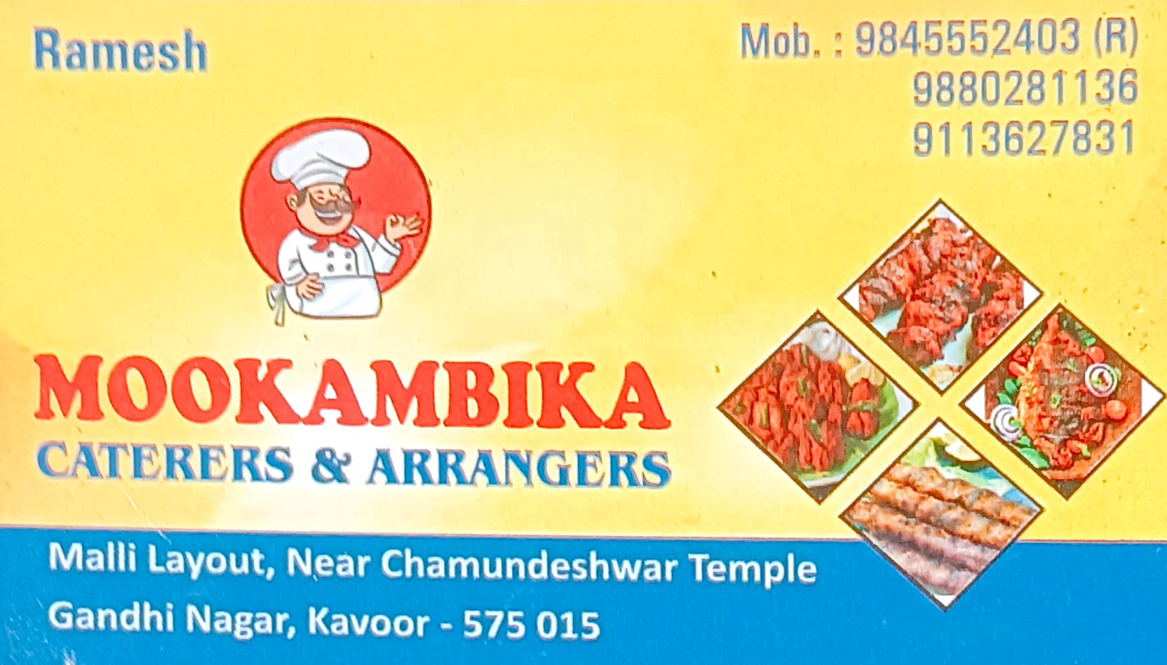 0 (0) MOOKAMBIKA CATERERS & ARRANGERS : Malli Layout, Near Chamundeshwar Temple, Gandhi Nagar, Kavoor, Mangalore : : : 9845552403, 9113627831, 9880281136 CATERERS & ARRANGERS Did you find this Ad helpful? Click on a star to rate it! Submit Ra...