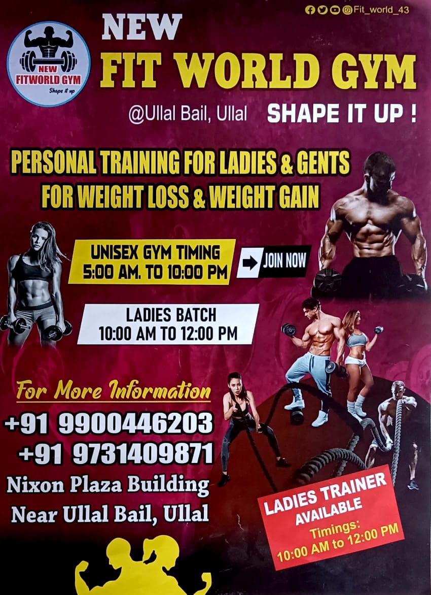 0 (0) NEW FIT WORLD UNISEX GYM : Nixon Plaza Building, Near Ullal Bail, Ullal, Mangalore : : : 9900446203, 9731409871 UNISEX GYM, LADIES GYM. LADIES GYM : TIMINGS : 6.00AM TO 12.00PM, 3.00PM TO 7PM UNISEX GYM : 5.30AM TO 10.00AM , 4.00PM TO 10.00PM. ...