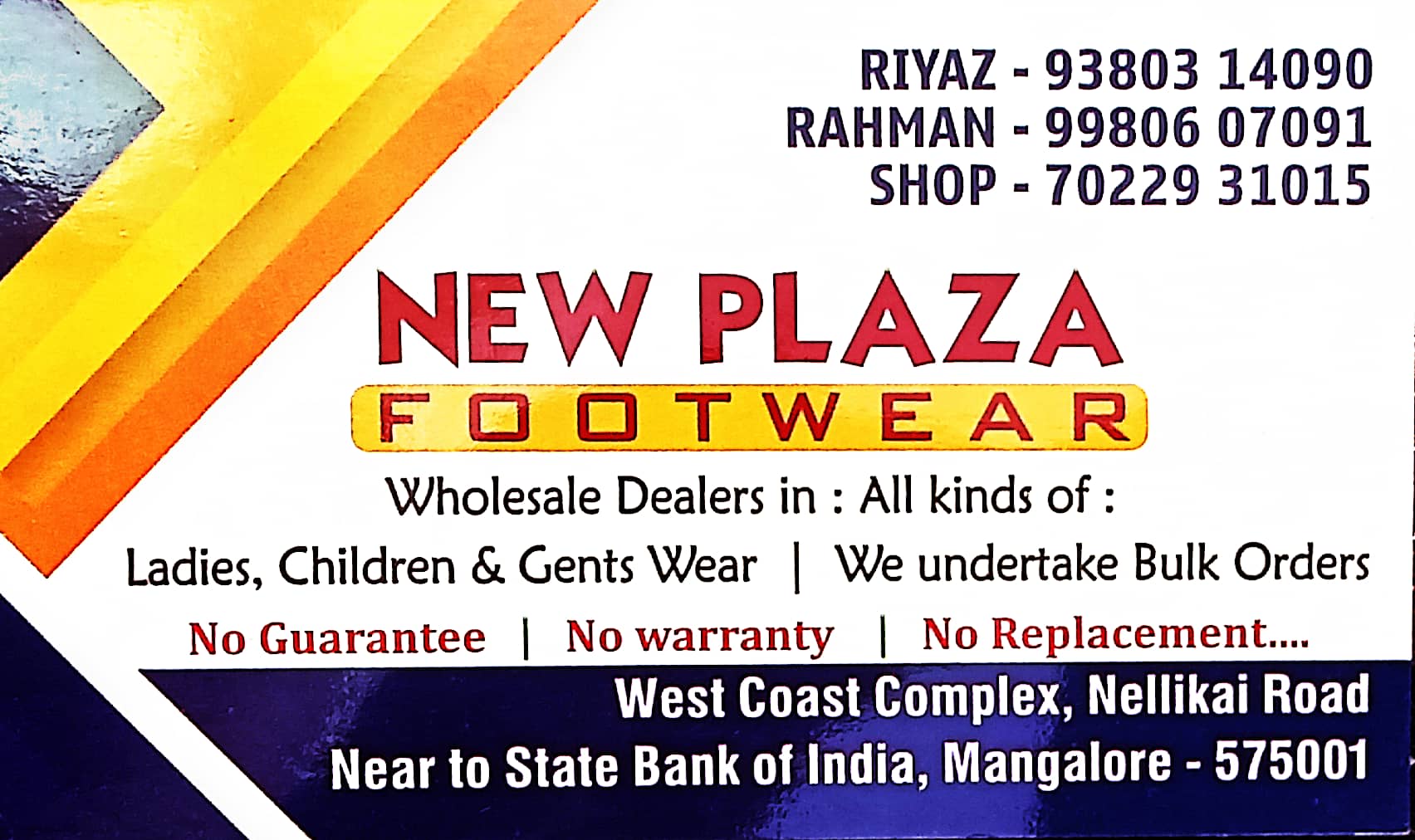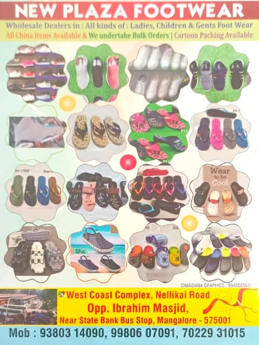 0 (0) NEW PLAZA FOOTWEAR : West Coast Complex, Nellikai Road, Near To stateBank Of India, Mangalore : : :9901610537, 9980607091, 7022931015 FOOTWEAR,WHOLESALE. TIMINGS : 9.00AM TO 7.30PM, SUNDAY : 9.00AM TO 2.00PM Did you find this Ad helpful? Click ...
