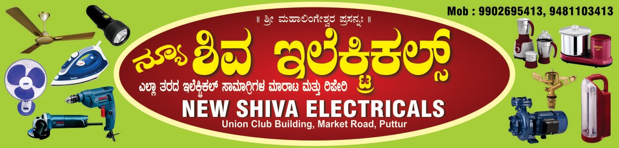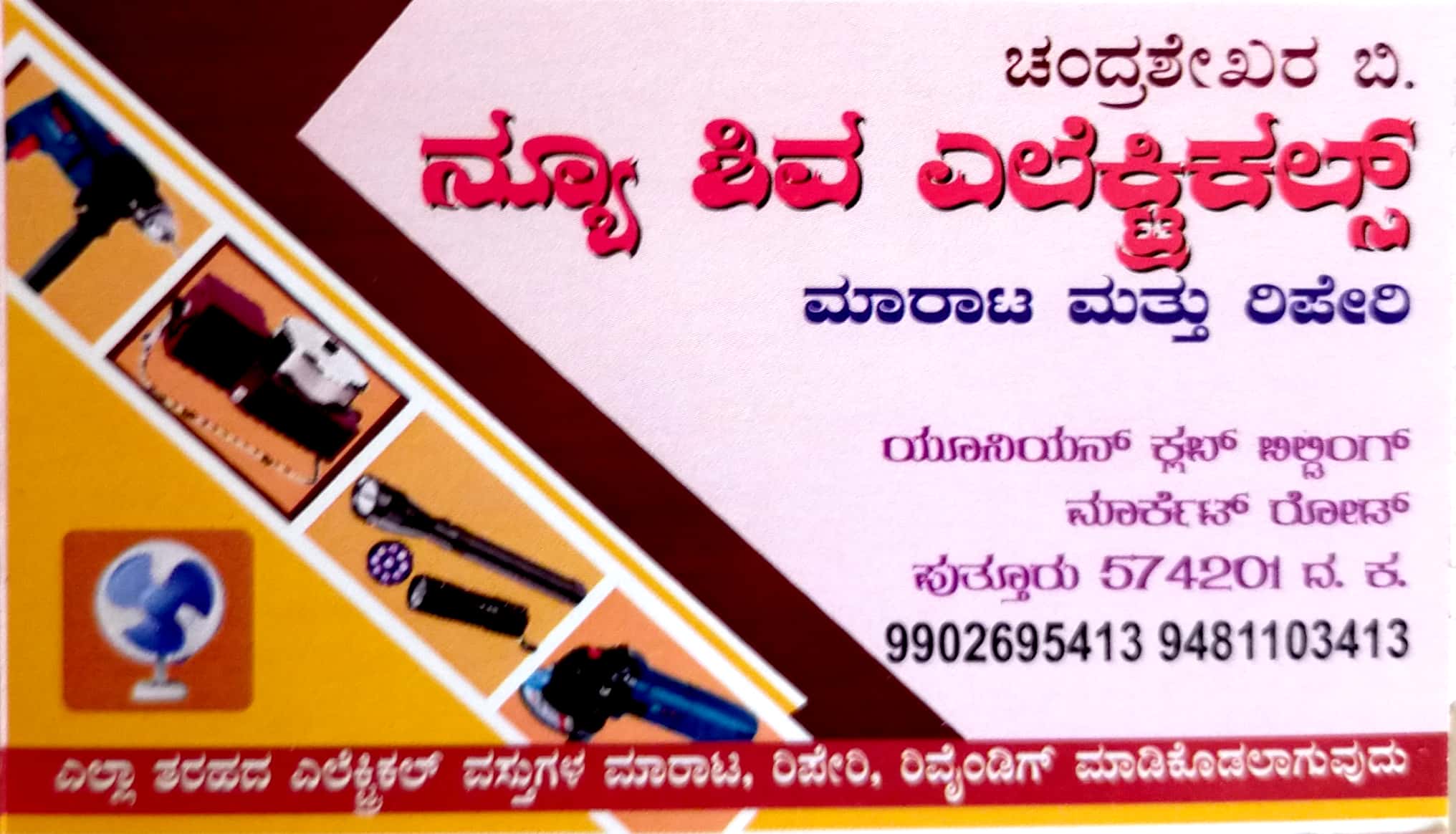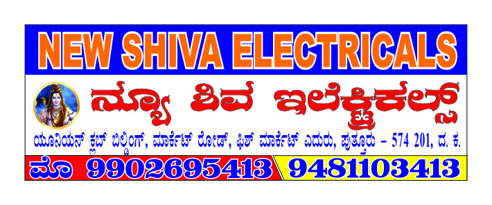 0 (0) NEW SHIVA ELECTRICALS : Union Club Building, Opp Fish Market, Puttur- 574201 : : : 9902695413, 9481103413 ELECTRICAL SALES & SERVICES, TIMINGS : 9.00AM TO 8.00PM, SUNDAY HOLIDAY Did you find this Ad helpful? Click on a star to rate it! Subm...