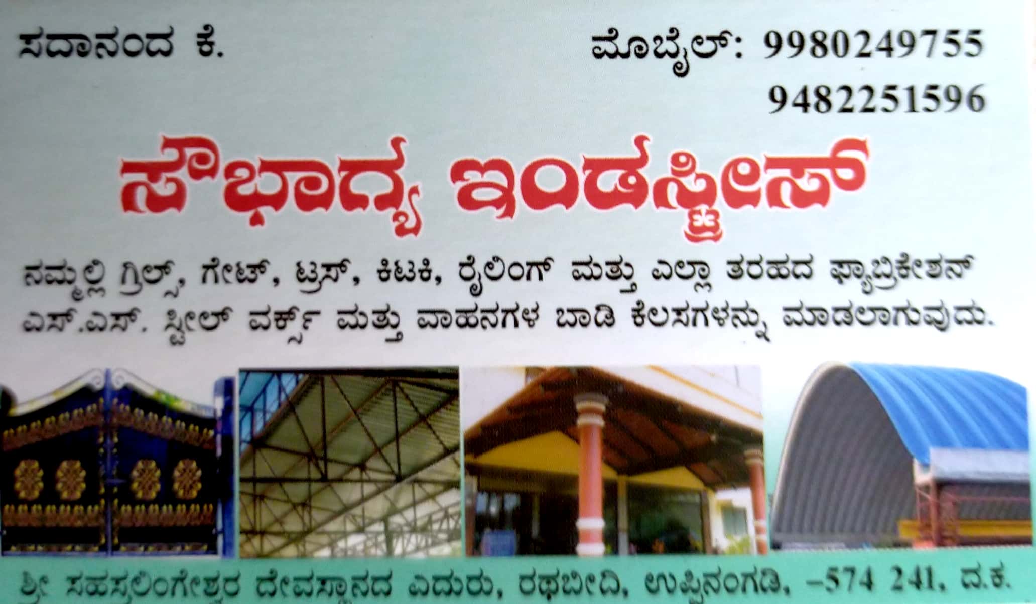 0 (0) NEW SOUBHAGYA INDUSTRIES : Opp Sahasralingeshwara Temple, Carstreet, Uppinangady, : : : 9980249755, 9482251596 TRESS WORK, FABRICATION WORK Did you find this Ad helpful? Click on a star to rate it! Submit Rating Thank you for Voting! No votes s...