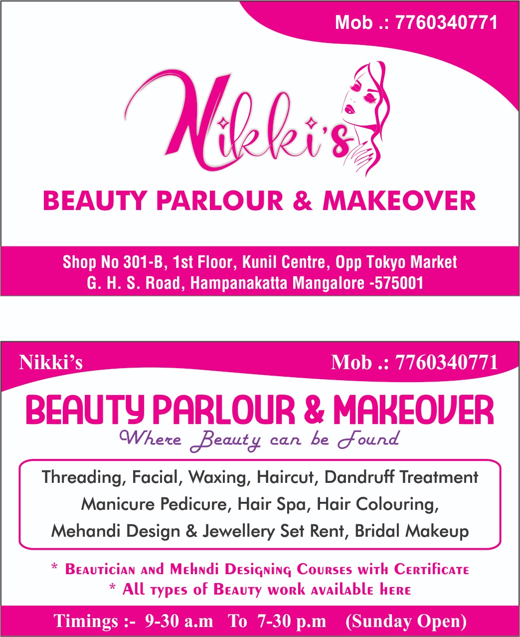 5 (2) NIKKI’S BEAUTY PARLOUR & MAKEOVER : Shop No 301-B, 1St Floor, Kunil Centre, Opp Tokio Market, GHS Road, Hampankatta, Mangalore 575001 : : : 8088875604 BEAUTY PARLUR, MAKEOVER STUDIO, TIMINGS : 9.30AM TO 7.30PM, SUNDAY ; 10.00AM TO 6.0...
