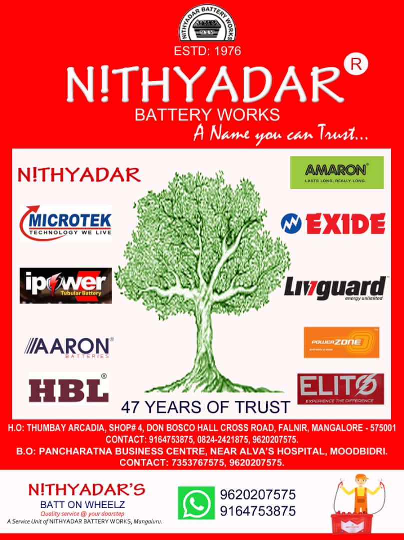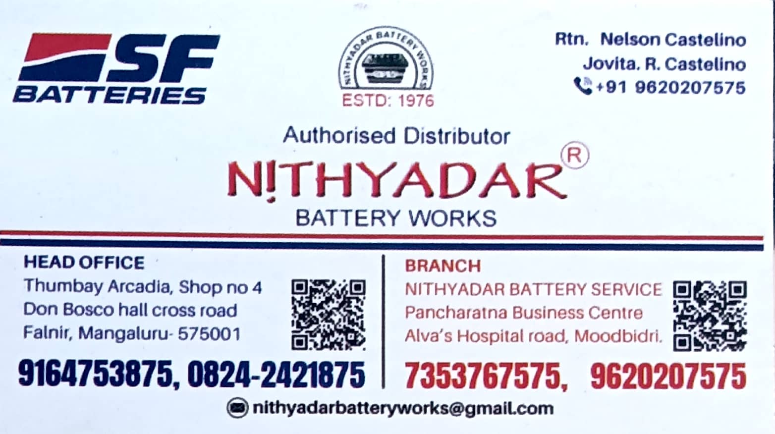 0 (0) NITHYADAR BATTERY WORKS : Shop no4, Thumbay Arcadia, Don Bosco Hall Cross Road, Falnir, Mangalore. : : : 0824-2421875, 9164753875, 9620207575 BATTERY, UPS/ AMC, ONSITE SERVICE.TIMINGS : 9.00AM TO 7.00PM, SUNDAY :9.00AM TO 7.00PM Did you find th...