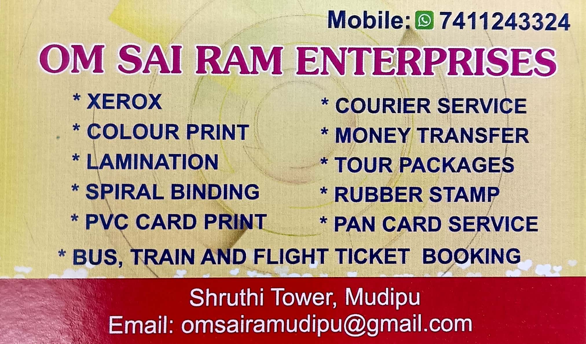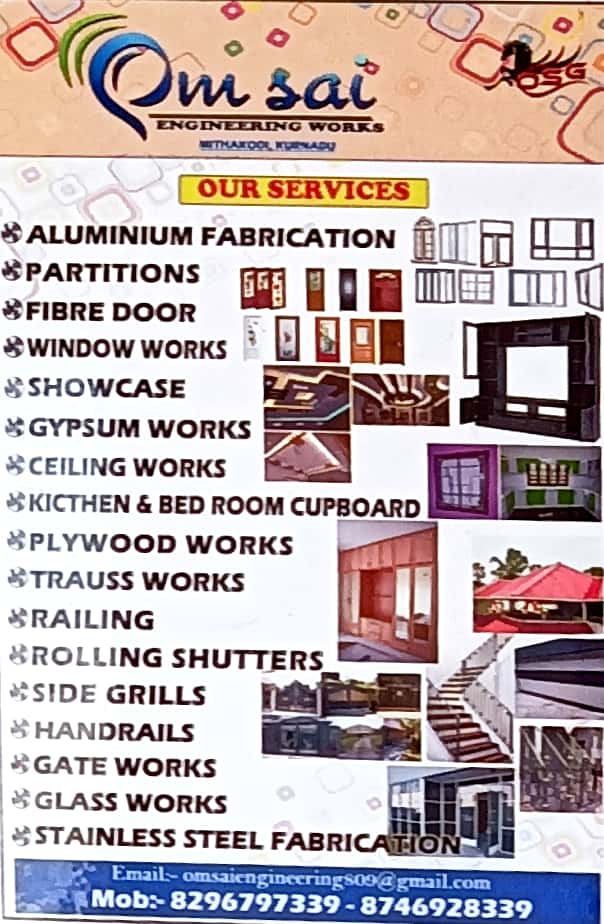 0 (0) OM SAI GROUPS/ OM SAI RAM ENTERPRISES/ OM SAI ENGINEERING : Shruthi Tower, Mudipu, Mangalore : : : 7411243324, 8746928339 FABRICATION WORK, INTERIOR WORK, TOUR PACKAGES, TICKET BOOKING, XEROX, COURIER SERVICE, ETC Did you find this Ad helpful? ...