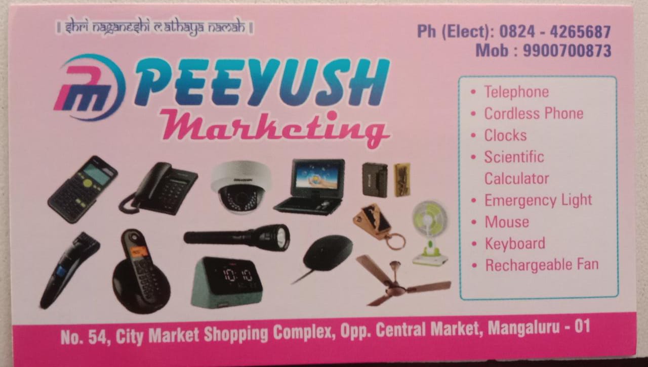 0 (0) PEEYUSH MARKETING : No 54, City Market Shoping Complex, opp Central Market, Mangalore 575001 : : : 9900700873 TELEPHONE, CORDLESS PHONE, CLOCKS, MOUSE, KEYBOARD,RECHARGABLE FAM Did you find this Ad helpful? Click on a star to rate it! Submit Ra...