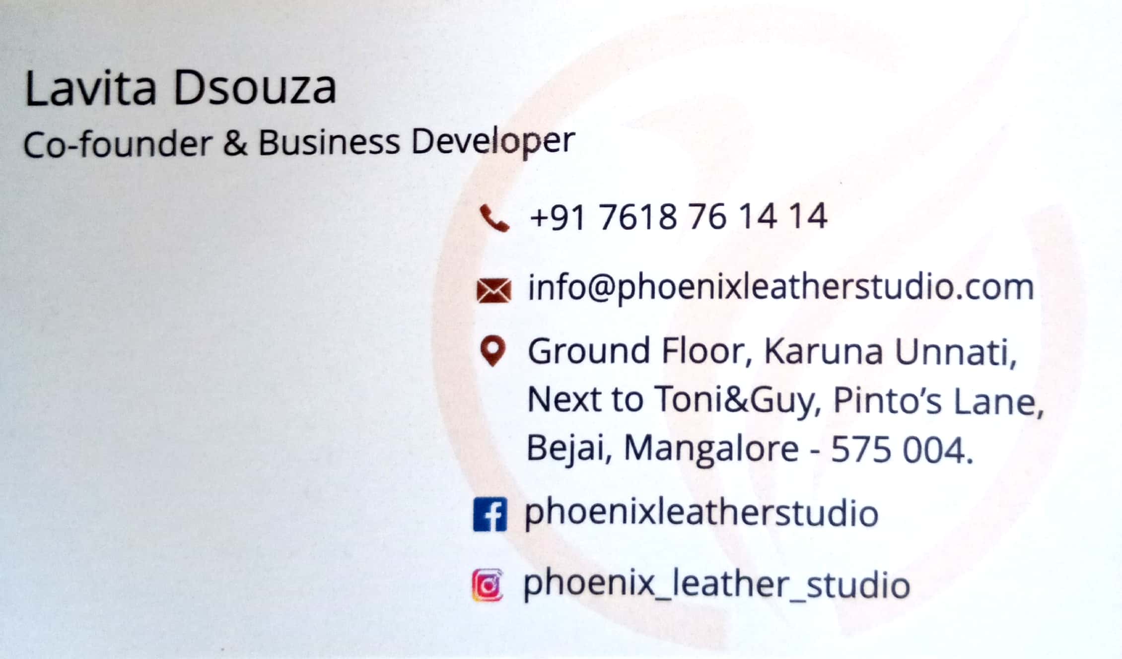 0 (0) PHOENIX ( LEATHER STUDIO) : Ground Floor, Karuna Unnati, Next To Toni & Guy Pintos Lane , Bejai, Mangalore 575004 : info@phoenixleatherstudio.com : : 7618761414, 9886394959 CAR INTERIOR, FURNITURE Did you find this Ad helpful? Click on a st...