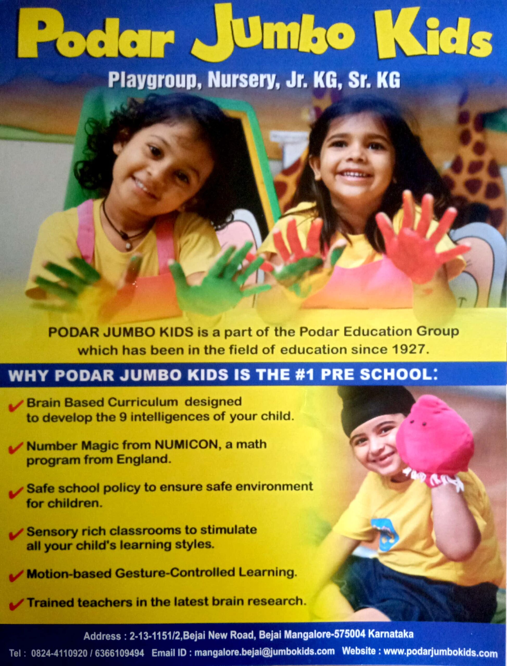 5 (1) PODAR JUMBO KIDS : 2-13-1151/2, Bejai New Road, Bejai, Mangalore-575004 : mangalore.bejai@jumbokids.com : : 6366109494, 0824-4110920 PLAY GROUND , NURSERY, JR KG, S KG, TIMINGS : 9.00AM TO 7.00PM, SUNDAY HOLIDAY Did you find this Ad helpful? C...