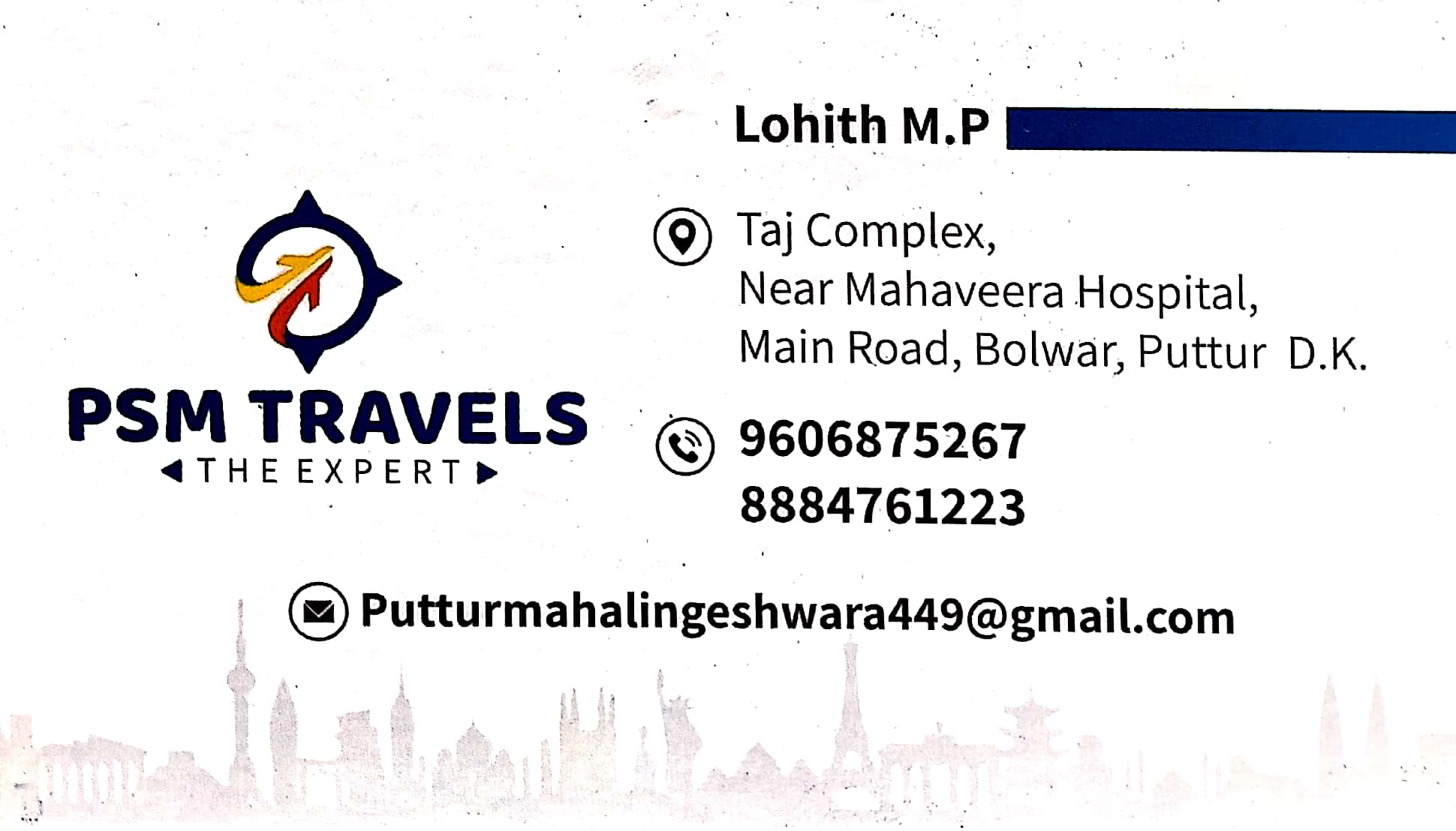 5 (1) PSM TRAVELS : Taj Complex, Near Mahaveera Hospital, Main Road, Bolwar, Puttur : : : 9606875267, 8884761223 AIR TICKET, PASSPORT, VISA SERVICE, INSURANCE, TOUR & RENT CAR, PANCARD Did you find this Ad helpful? Click on a star to rate it! Sub...
