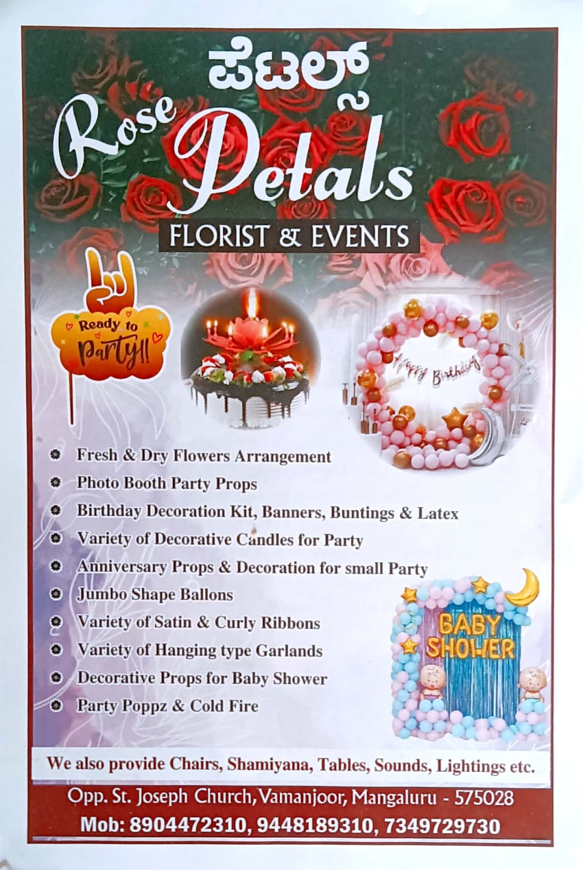 0 (0) ROSE PETALS FLORIST & EVENTS : Opp St Joseph Church Vamanjoor, Mangalore : : : 8904472310, 9448189310, 7349729730 PARTY SHOP, FLORIST, EVENTS. TIMINGS : 8.00AM TO 8.00PM, SUNDAY : 8.00AM TO 5.00PM. Did you find this Ad helpful? Click on a s...