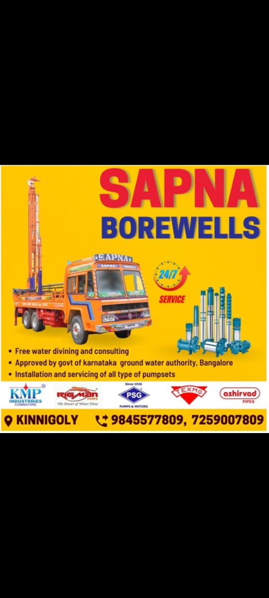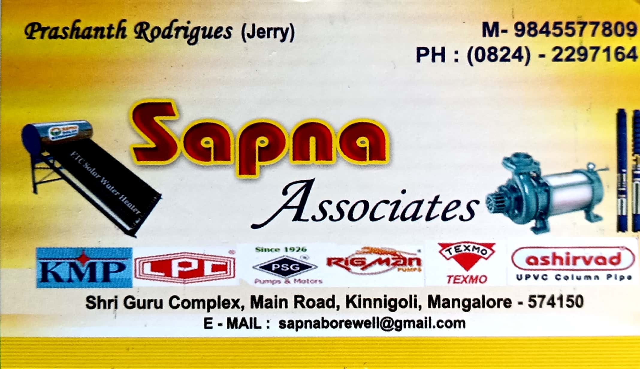 0 (0) SAPNA BOREWELLS/ SAPNA ASSOCIATES : Near Little Flower Highschool, Kinnigoli, Mangalore 574150 : : : 9845577809, 725900809 BOREWELLS, SOLAR SYSTEM, PUMPSETS, TIMINGS : 24 HOURS Did you find this Ad helpful? Click on a star to rate it! Submit Ra...