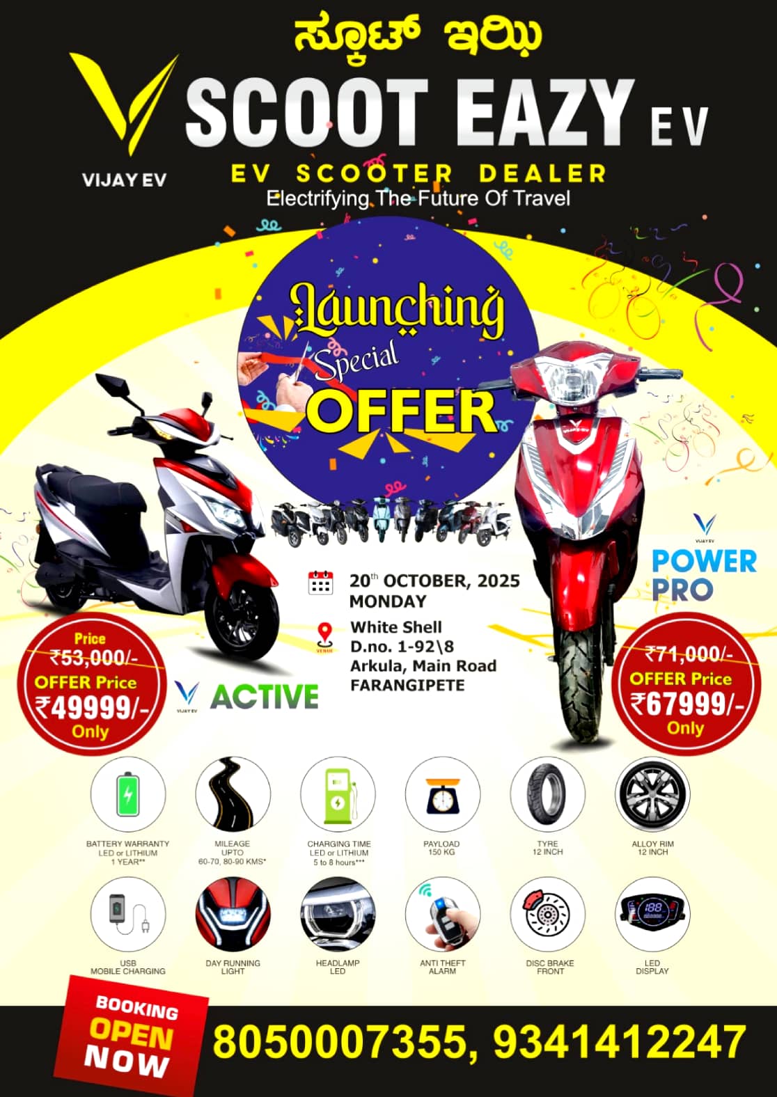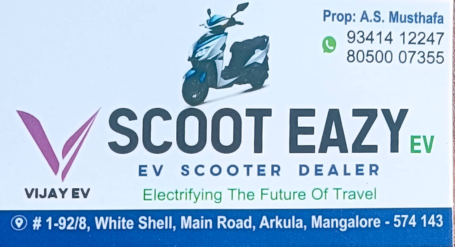 5 (1) SCOOT EAZY EV : #1-92/8, White Shell, Main Road, Arkula, Mangalore : : : 9341412247, 8050007355 ELECTRIC SCOOTER, EV SCOOTER. TIMINGS : 9.30AM TO 6.30PM, SUNDAY : 9.30AM TO 1.00PM. Did you find this Ad helpful? Click on a star to rate it! Subm...