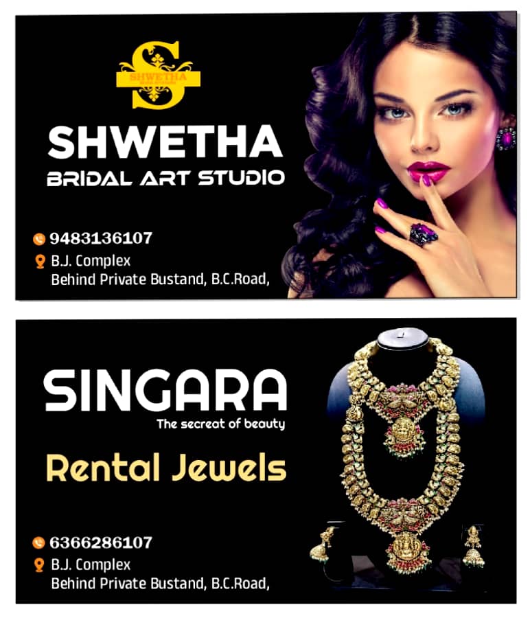 0 (0) SHWETHA BRIDAL ART STUDIO-SINGARA RENTAL JEWELS : Ground Floor, BJ Complex, Behind Bustand, BC Road. : : : 6366286107, 9483136107, 9481976007 BEAUTY PARLOUR, RENTAL JEWELLERY. TIMINGS : 9.00AM TO 7.00PM, SUNDAY : 9.00AM TO 1.00PM. Did you find...
