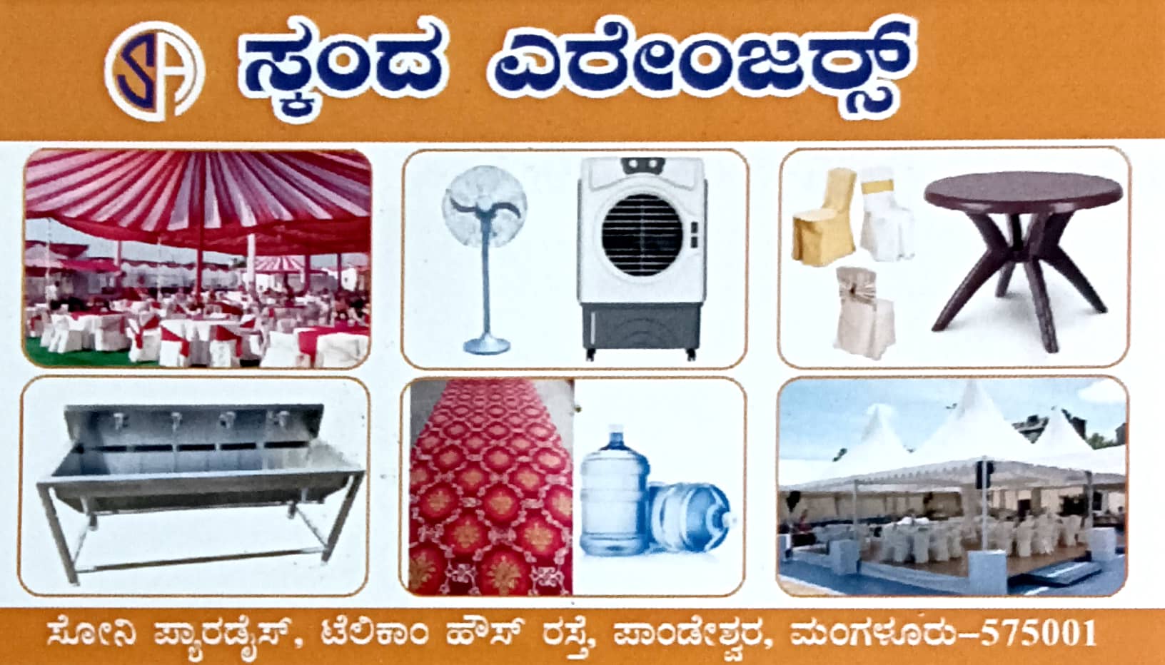 0 (0) SKANDA ARRANGERS : Sony Paradise, Telecom House Road, Pandeshwara,Mangalore : : : 9845232957, 9986166977 ARRANGERS, EVENT ORGANIZER, CAERING SERVICE. Did you find this Ad helpful? Click on a star to rate it! Submit Rating Thank you for Voting! ...