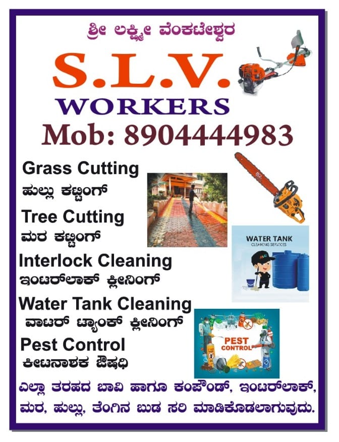 5 (1) SLV WORKERS : Near Idya Park, Beach Road, Surathkal, Mangalore : : : 8904444983, 8431152901 GRASS CUTTING, TREE CUTTING, WATER TANK CLEANING, PEST CONTROL, INTERLOCK CLEANING. Did you find this Ad helpful? Click on a star to rate it! Submit Rat...