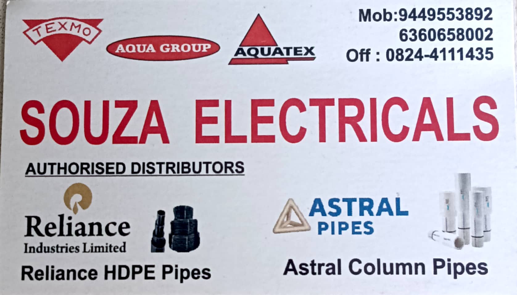 0 (0) SOUZA ELECTRICALS : Zubaida Commercial Complex, Azizuddin 4th Cross, Behind Urdu School, Bunder, Mangalore : : : 9449553892, 6360658002 ELECTRICALS, PUMP SALES & SERVICES. TIMINGS : 9.00AM TO 6.00PM. SUNDAY HOLIDAY. Did you find this Ad hel...