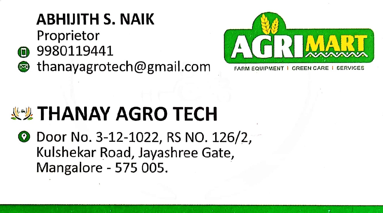 0 (0) THANAY AGRO TECH : Door No 3-12-1022, RS No 126/2, Kulshekar Road, Jayashree Gate, Mangalore 575002 :thanyagrotech@gmail.com : : 9980119441, 7892409885 FARM EQUIPMENT SALES & SERVICE, AGRICULTURE EQUIPMENT, TIMINGS : 9.00AM TO 5.45PM, SUNDA...