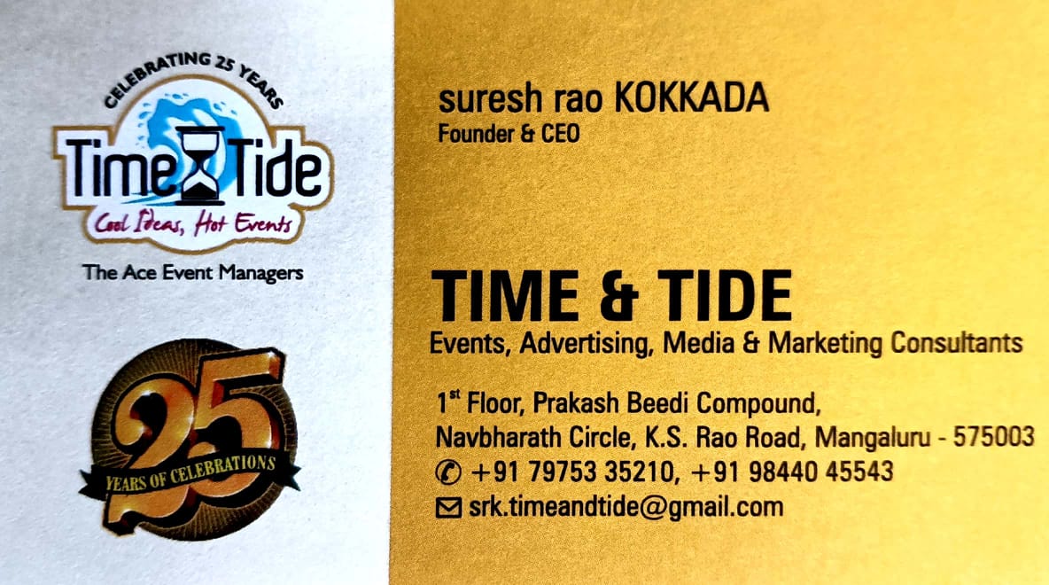 0 (0) TIME & TIDE : 1St Floor, Prakash Beedi Compund, Navabharath Circle, KS Rao Road, Mangaluru 575003 : : : 7975335210, 9844045543 EVENT ORGANIZER Did you find this Ad helpful? Click on a star to rate it! Submit Rating Thank you for Voting! No votes so far! Be the first to rate this ad.