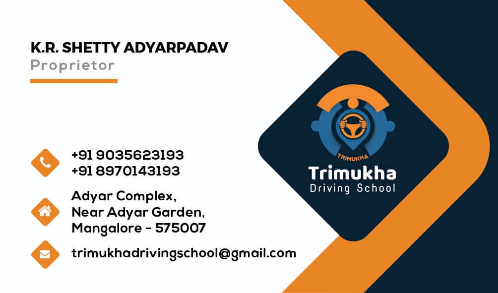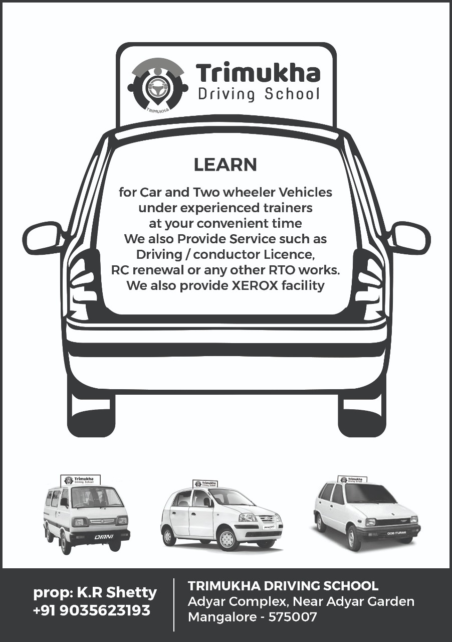 4.5 (2) TRIMUKHA DRIVING SCHOOL : Adyar Complex, Near Adyar Garden, Adyar, Mangalore : : : 9035623193, 8970143193 DRIVING SCHOOL, TIMINGS : 6.00AM TO 6.30 PM, SUNDAY CLOSED Did you find this Ad helpful? Click on a star to rate it! Submit Rating Thank...